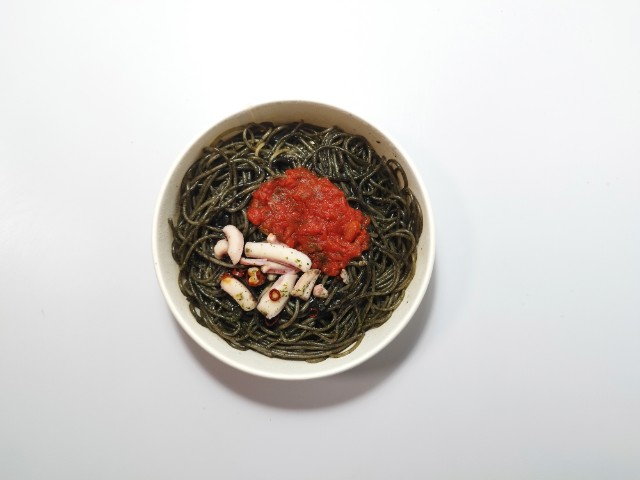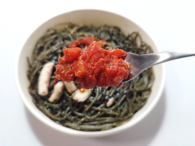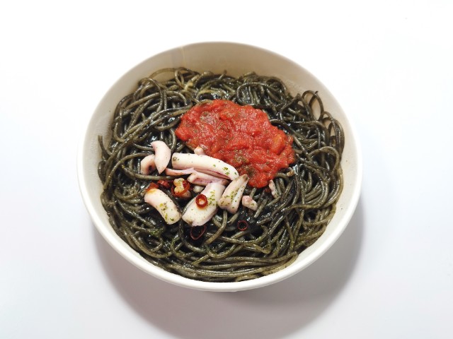イカスミや刻んだイカを使用した黒いソースに、トマトソースとイカを盛り付けたイカ墨パスタです。