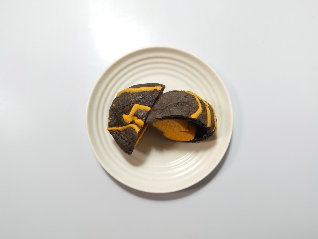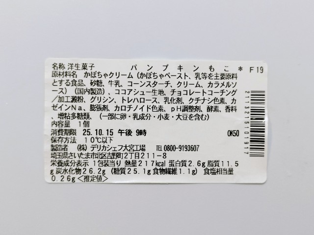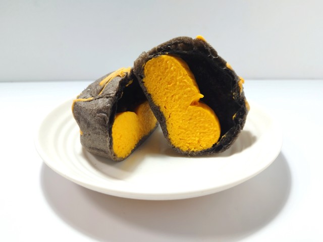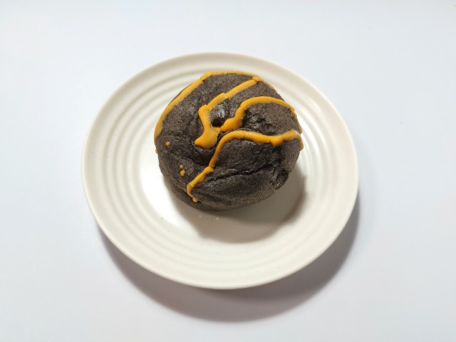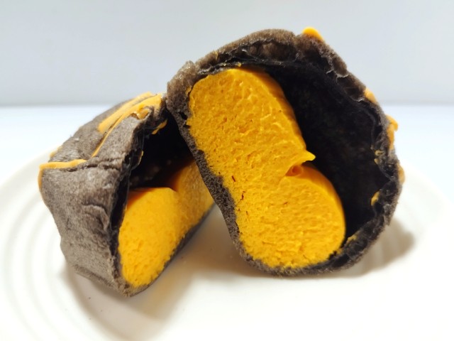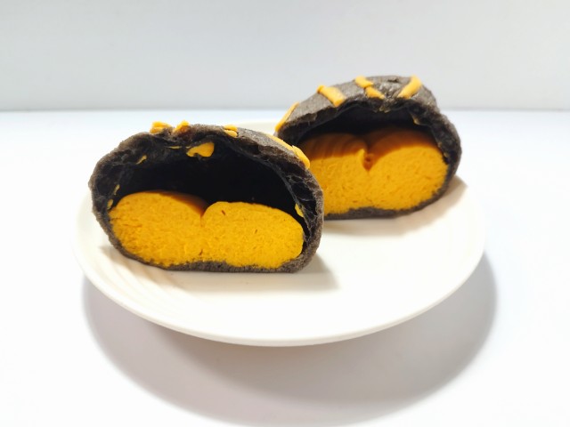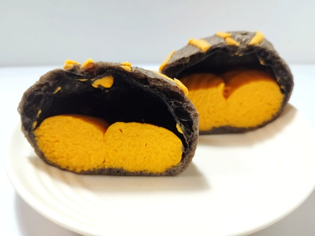 かぼちゃペーストのクリームを使ったシュークリームです。セブンイレブンでは10月7日から「こわかわブラック!おいしいハロウィン!」を開催していて、今回の商品もその対象商品の一つとなっています。そんなパンプキンもこですが、シュー生地はうっすらココアの風味を感じるもっちり食感で、イメージする普通のシュー生地とはまた違って、食感を楽しむ事が出来ます。生地に線掛けされたチョコはほどよい甘味で、味のアクセントになっています。かぼちゃペーストを使ったクリームはなめらかな食感とかぼちゃの味わい、やさしい甘味で、生地とのバランスも良いです。大きさは普通のシュークリームサイズで、おやつや食後のデザートにピッタリです。ぜひパンプキンもこを食べてみて下さい。