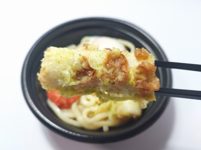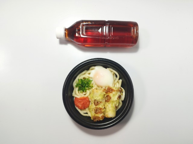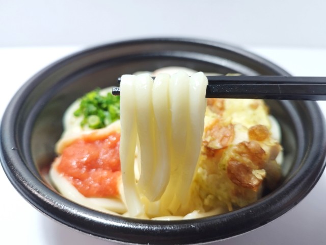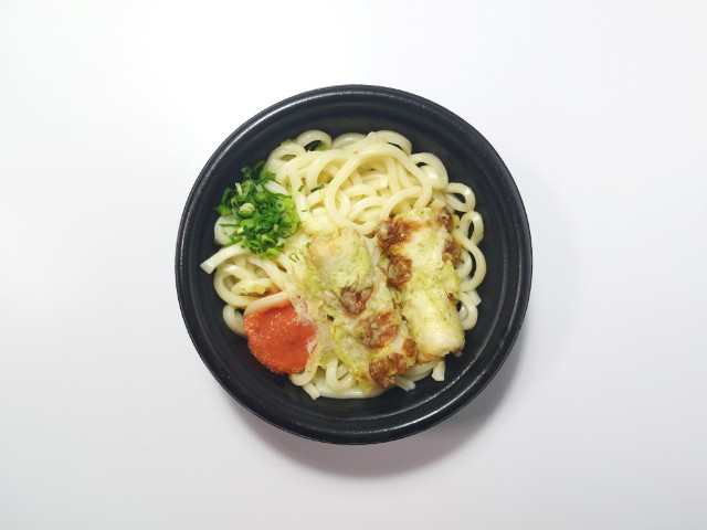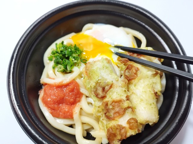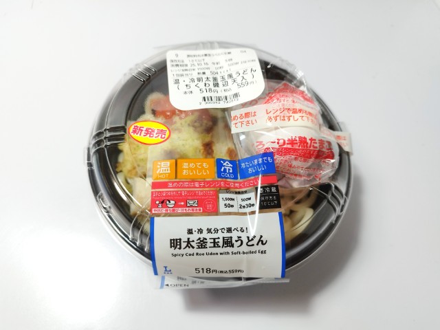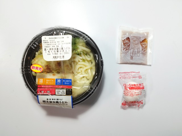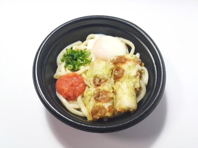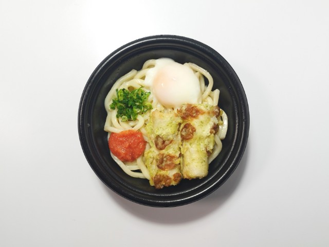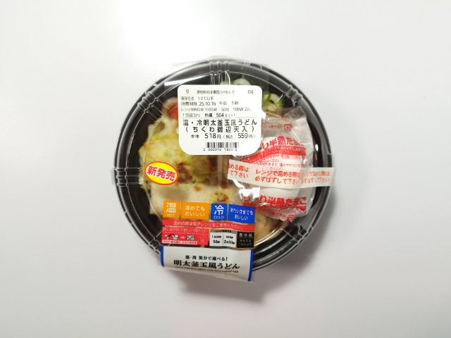 ローソンの商品「温・冷 気分で選べる!明太釜玉風うどん(ちくわ磯辺天入り)」を食べてみました。