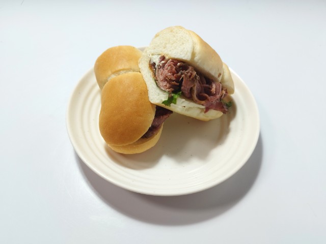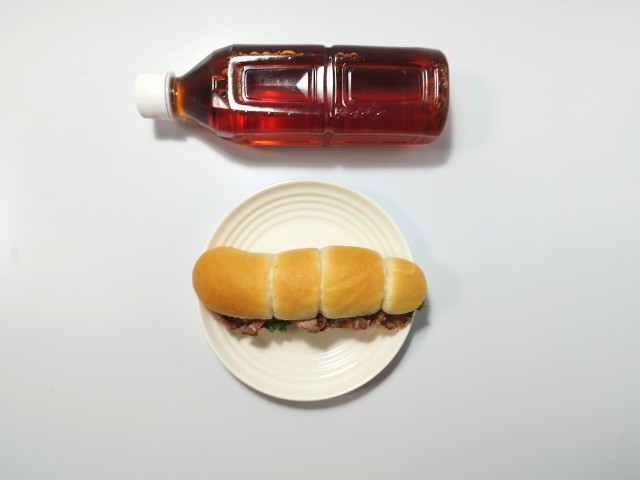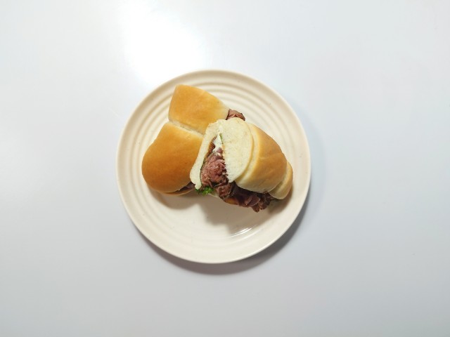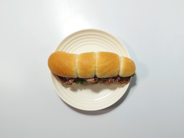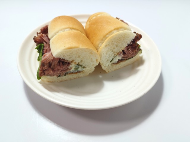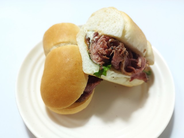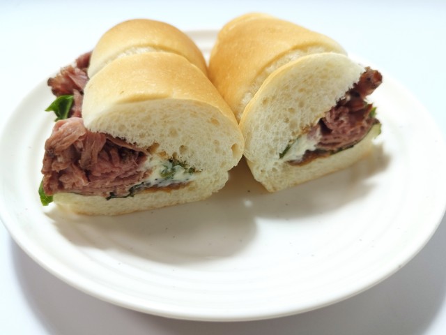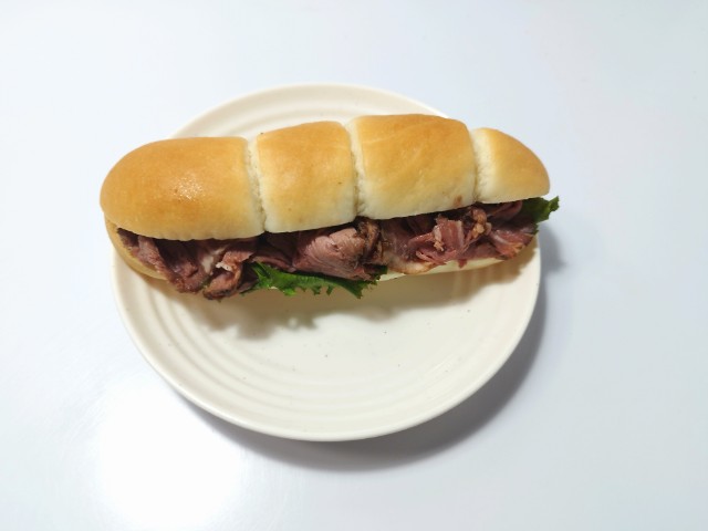 ローストビーフを挟んだロールパンです。以前にローストビーフ&クリームチーズ(2024年12月11日発売)がありましたが、今回はローストビーフと2種類のソースを使ったロールパンになっています。そんなローストビーフロールですが、生地はしっとりとした食感と歯切れの良さで、間違いのない美味しさです。具材であるローストビーフは、牛の旨味としっとりした食感で、生地とのバランスも良いです。ポイントはやはり2種類のソースで、玉ねぎの甘味と醤油の風味を感じるソースと山わさびの香りとピリッとした辛味も感じるソースが、ローストビーフの美味しさをさらに引き立てています。他にもリーフレタスや玉ねぎが食感のアクセントになっていたりと、最後のひと口まで飽きることなく食べられます。大きさは普通のコッペパンより少し細いくらいなので、一人でも普通に食べ切れます。ぜひローストビーフロールを食べてみて下さい。