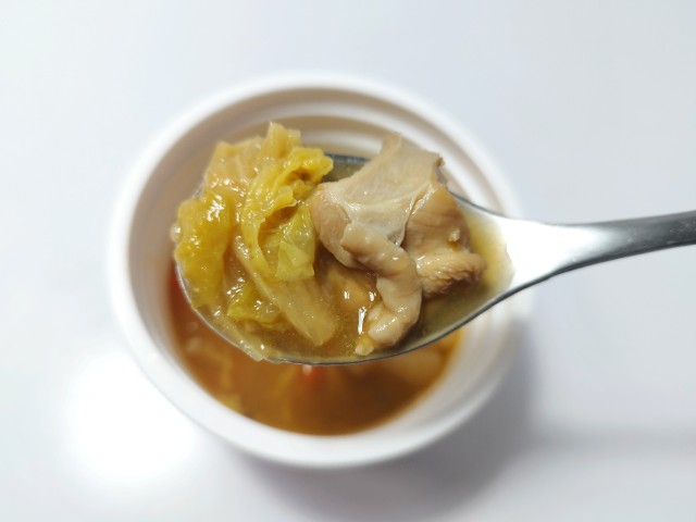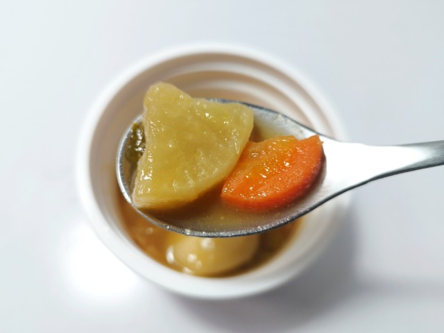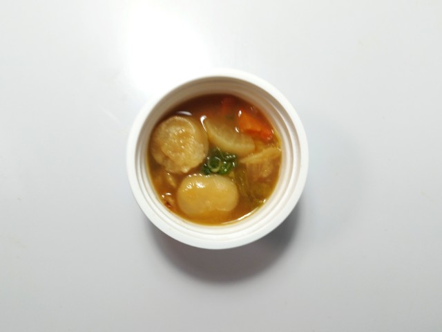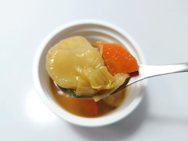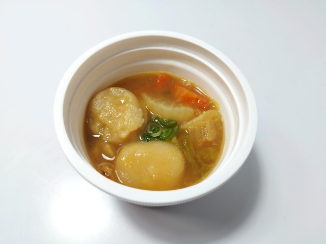 すいとんです。セブンイレブンでは1月20日から全国のご当地スープ(9種類)を味わえる「日本横断!ご当地スープ巡り」を全3回に分けて開催していて、今回の商品もその対象商品の一つとなっています。ちなみに今回の商品は第3弾になっていて、第1弾(3種類)は11月4日から順次発売、第2弾(3種類)は11月25日順次発売されました。そんなもっちりすいとんですが、つゆは醤油の風味と味噌のコク、野菜の甘味があって、飲み干してしまいたくなる美味しさです。具材にはすいとんを始め、鶏肉や白菜、人参、大根、椎茸など色々と入っていて、食べ応えがあります。内容量は一人分にちょうどよく、小腹が空いた時や主食にあと一品追加したい時にピッタリです。ぜひもっちりすいとんを食べてみてください。
