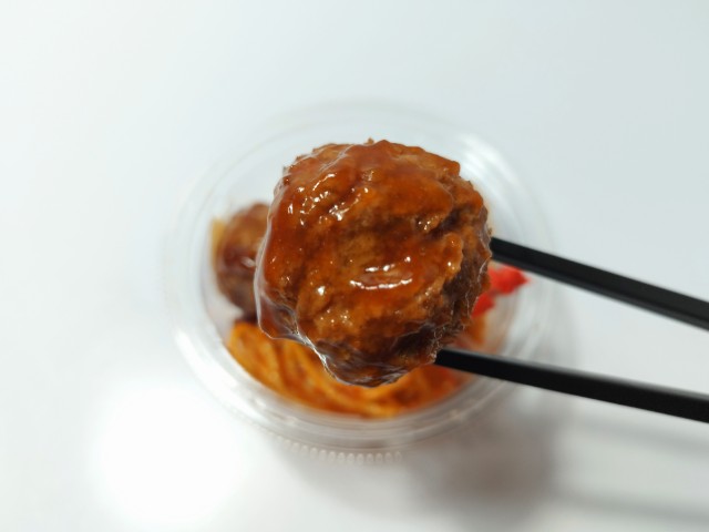 ミートボールとタコさんウインナー、ナポリタンのカップデリです。以前にもタコさんウインナー&カレーマカロニ(2025年7月17日発売)にてタコさんウインナーの存在は知ってましたが、今回はミートボールとの組み合わせになっています。そんなミートボールとタコさんウインナーですが、タコさんウインナーはタコの見た目以外は、普通の美味しい赤ウインナーです。ミートボールは鶏の旨味とほどよい弾力、タレの甘味で、美味しいのひと言です。他にもナポリタンも付いていて、洋風惣菜セットのようになっています。このまま食べるのはもちろんですが、お弁当に詰めても良いと思います。カップデリなので内容量は多くはありませんが、おつまみやおかずをもう一品追加したい時にピッタリの商品です。ぜひミートボールとタコさんウインナーを食べてみて下さい。