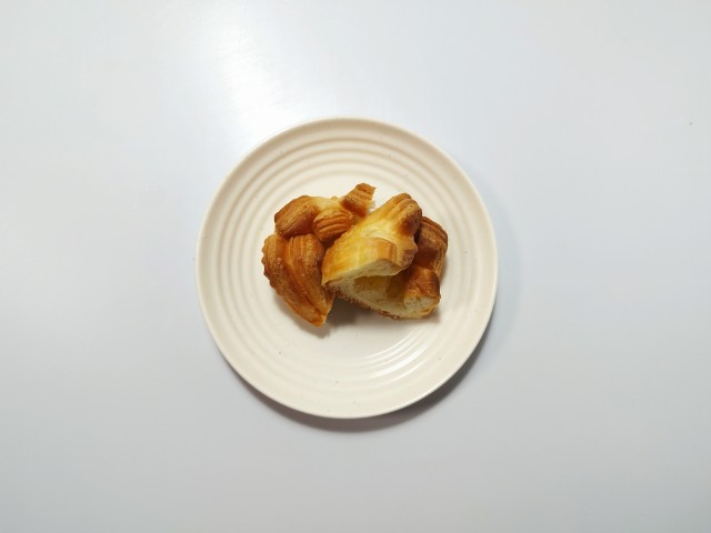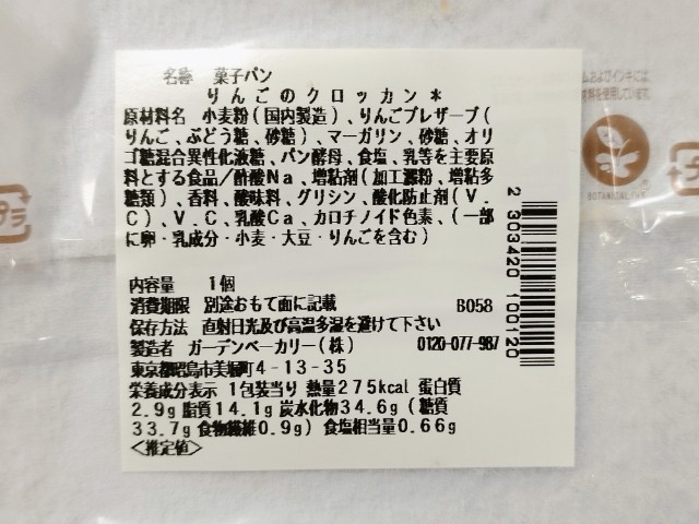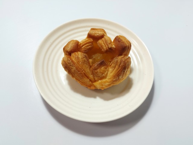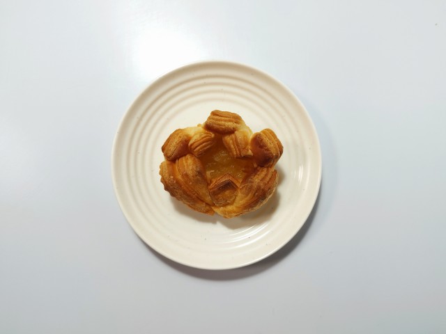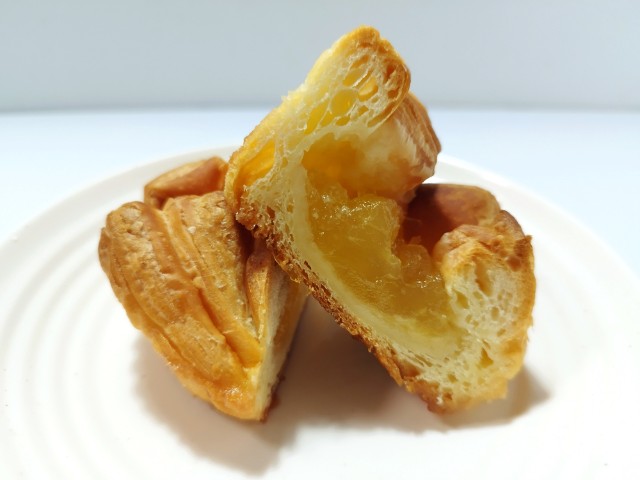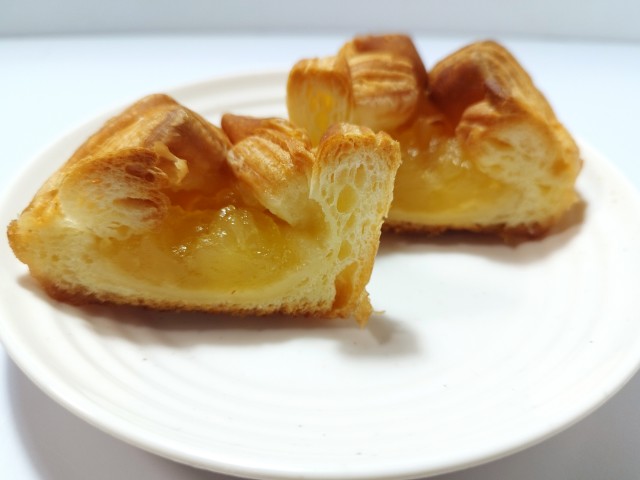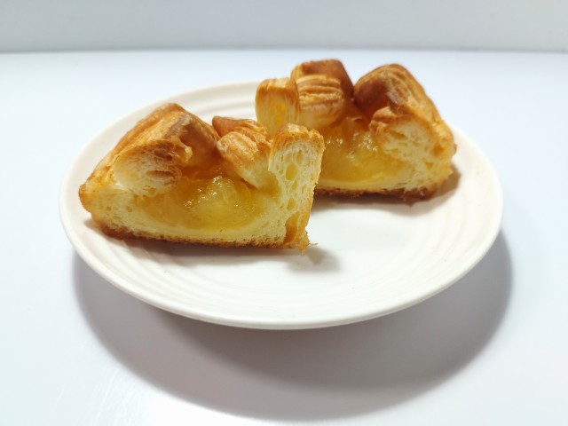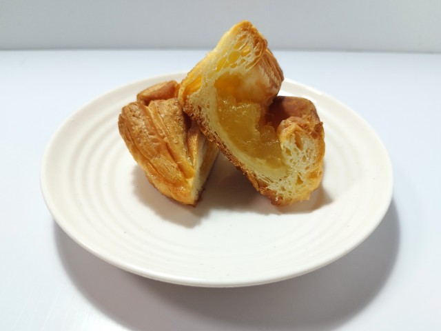 りんごのクロッカンです。ちなみにクロッカンをネットで調べたところ、フランス語で「カリカリッとした」という意味で、その名の通りクロワッサン生地やデニッシュ生地などを細かくカットし、ナッツや砂糖、キャラメルなどと一緒に焼き上げたパンまたは焼き菓子だそうです。そんなりんごのクロッカンですが、生地はふんわりとした食感と歯切れの良さで、美味しいのひと言です。中にはりんごのプレザーブがのっていて、じゅわっとした食感と甘酸っぱい味わいで生地とのバランスも良いです。また、底面にはキャラメリゼがしてあって、飴の甘味とザクザクとした食感を楽しむ事が出来ます。大きさは普通の菓子パンサイズで、おやつや小腹が空いた時にピッタリです。ぜひりんごのクロッカンを食べてみて下さい。