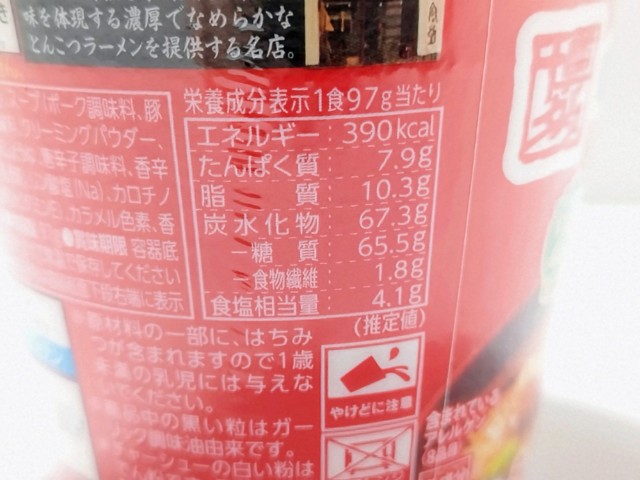 熱量:390kcal、たんぱく質:7.9g、脂質:10.3g、炭水化物:67.3g(糖質:65.5g、食物繊維:1.8g)、食塩相当量:4.1g