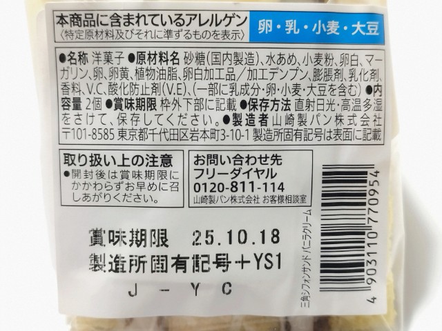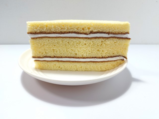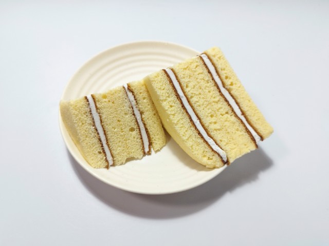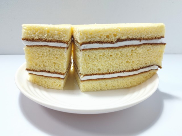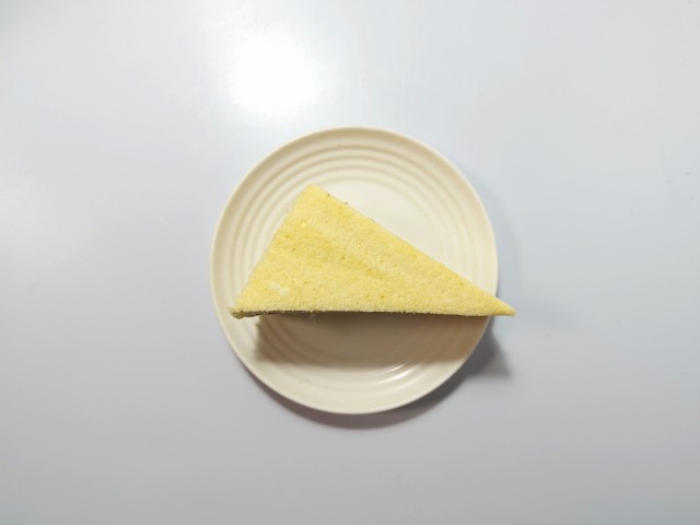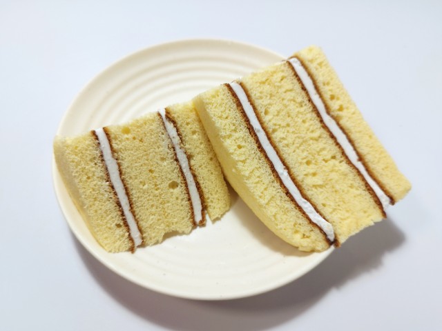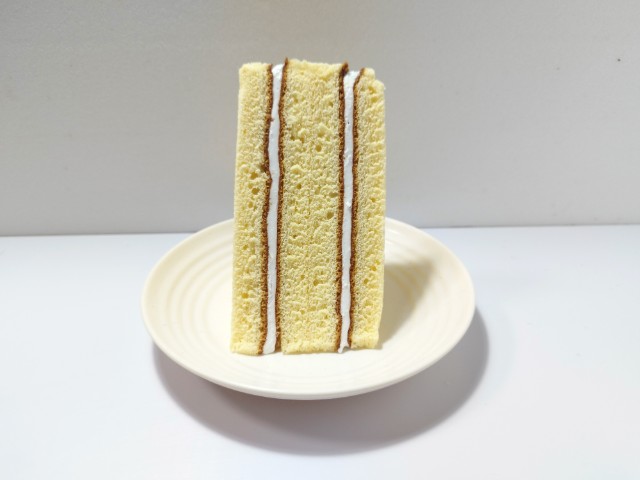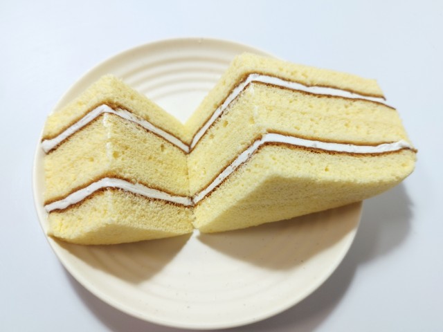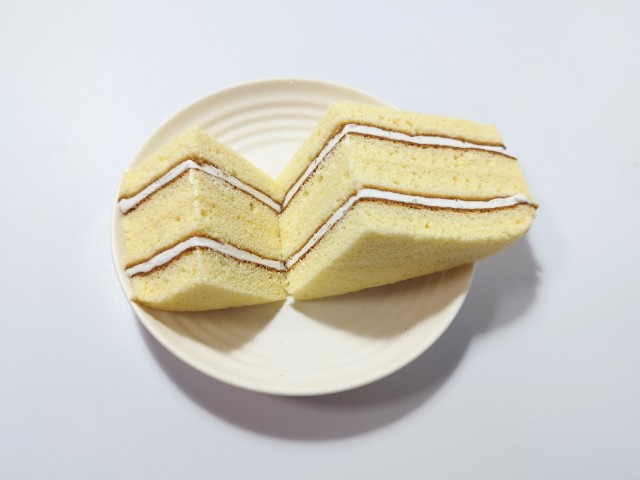 バニラクリームを挟んだ三角シフォンサンドです。以前に7P三角シフォンサンドキリマンジャロコーヒー(2025年7月1日発売)がありましたが、今回はバニラクリームになっています。そんな三角シフォンサンドですが、三角形のスポンジ生地はふんわりとした食感とたまごの風味で、これだけでも美味しく食べ進められます。中のバニラクリームはなめらかな食感とバニラの風味で、スポンジ生地ともよく合います。くちどけの良さもあって、甘ったるさが残らないので、甘いのがちょっと苦手な方にも食べやすいと思います。大きさは普通のサンドイッチくらいで、おやつや小腹が空いた時にピッタリです。ぜひ三角シフォンサンドを食べてみて下さい。