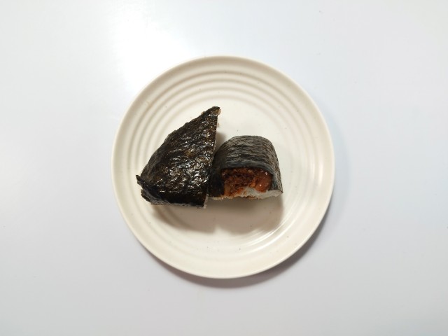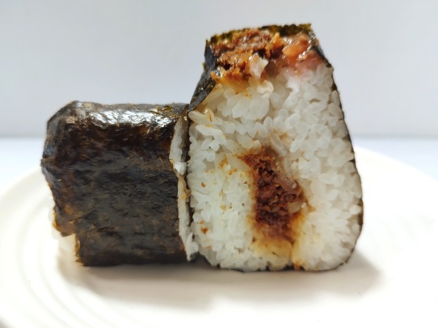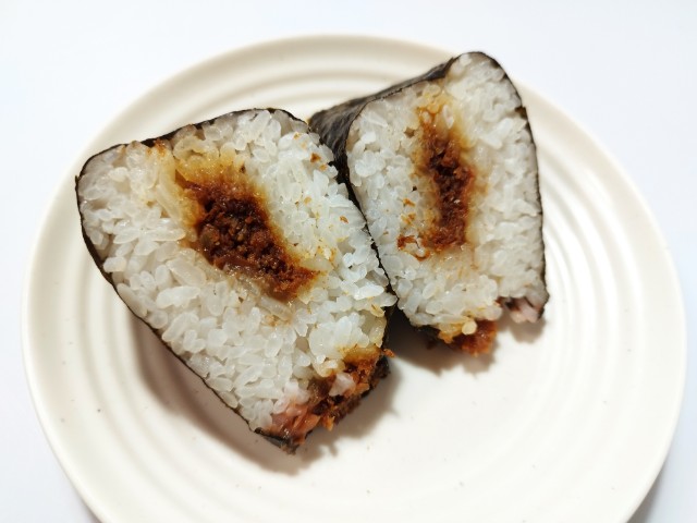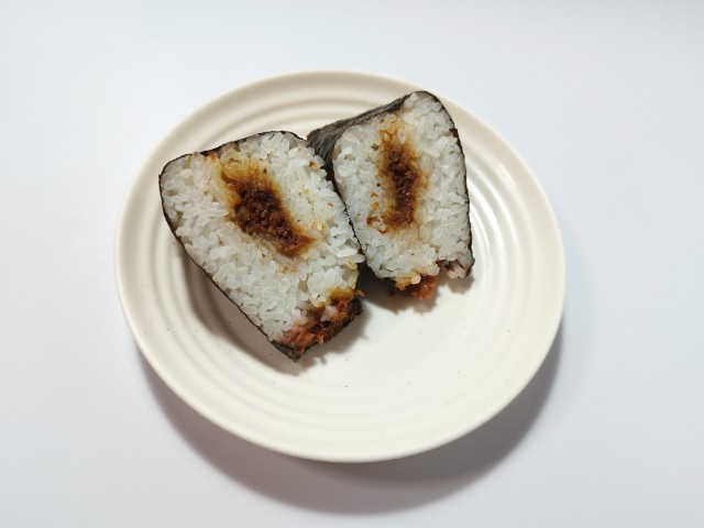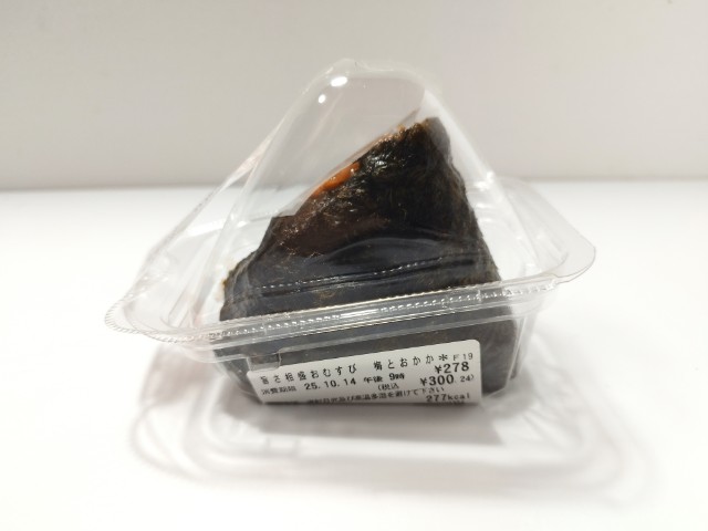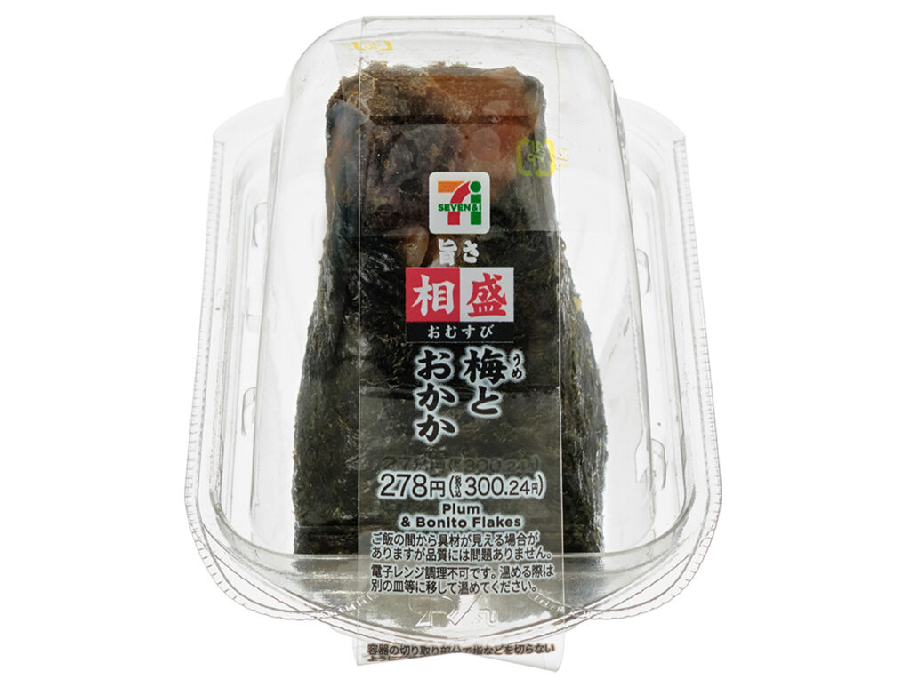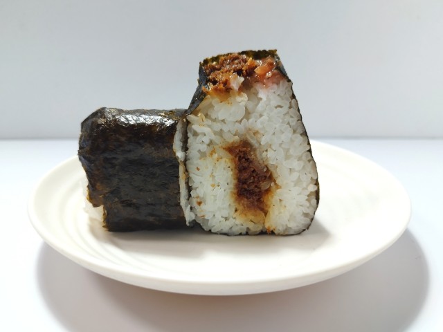 梅とおかかを使ったおむすびです。中具だけでなく、頭頂部にも具材がのったおむすびで、梅とおかかといった定番具材の組み合わせになっています。そんなおむすびですが、梅は梅の風味とほどよい酸味があって、ご飯が進む一品になっています。おかかはかつおの旨味と醤油の風味で、間違いのない美味しさです。梅とおかかが合わさる事でさらに美味しさが増すのがポイントで、最後のひと口まで飽きることなく食べられます。具材の美味しさにご飯も進みますが、今回は通常のおむすびよりもご飯の量が約1.5倍になっているので、ご飯が足らなくなる心配はありません。ぜひ梅とおかかの旨さ相盛おむすびを食べてみて下さい。
