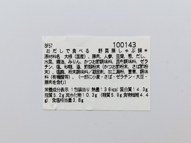 1/3日分の野菜が入った豚しゃぶ鍋です。これからの時期にピッタリの一品で、野菜もしっかりと摂れるとあって買ってました。そんな野菜豚しゃぶ鍋ですが、つゆはかつおだしの旨味と醤油の風味、さっぱりとした後味で、間違いのない美味しさです。具材には豚肉を始め、人参や大根、ねぎ、水菜といった野菜などが入っていて、それぞれの味や食感を楽しめます。そこそこボリュームはあるものの、やさしい味付けもあって、あっさりと食べられます。136kcalという低カロリーも嬉しいポイントで、深夜でも安心して食べられます。内容量は一人分にちょうどよく、ご飯のおかずやお酒のお供にピッタリです。ぜひ野菜豚しゃぶ鍋を食べてみて下さい。