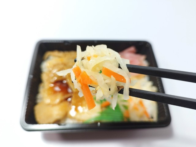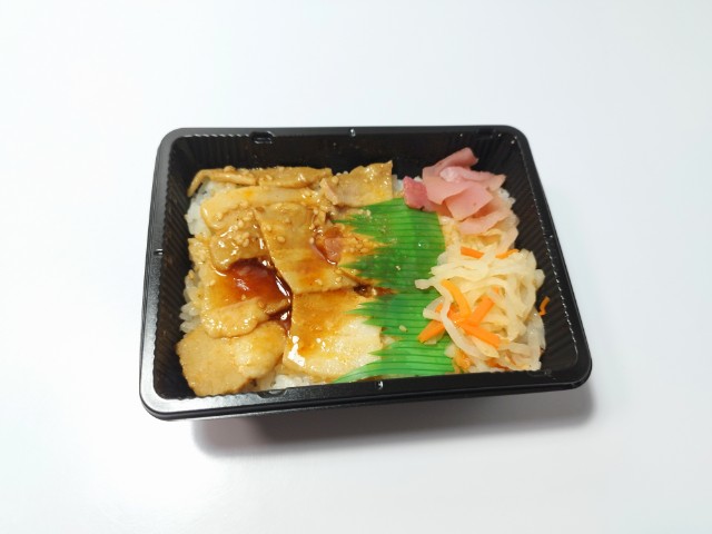 豚カルビがのったミニ弁当です。豚カルビを使ったシンプルなお弁当で、その見た目と味が気になって買ってみました。そんな豚カルビ弁当ですが、豚カルビにはジューシーな味わいと甘辛いタレの味わいで、ご飯が進む一品になっています。豚カルビの他に大根と人参のナムルと大根漬けものっていて、こちらは箸休めにピッタリです。お弁当は小容量なので小腹が空いた時や軽く食べたい時などにちょうどよく、別にサラダやカップ麺などを付けてバランスや味を楽しむのも、このサイズのお弁当なら余裕で出来ます。ぜひ豚カルビ弁当を食べてみて下さい。