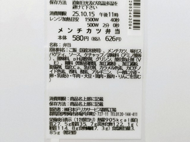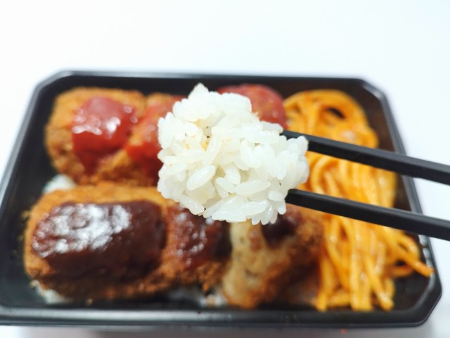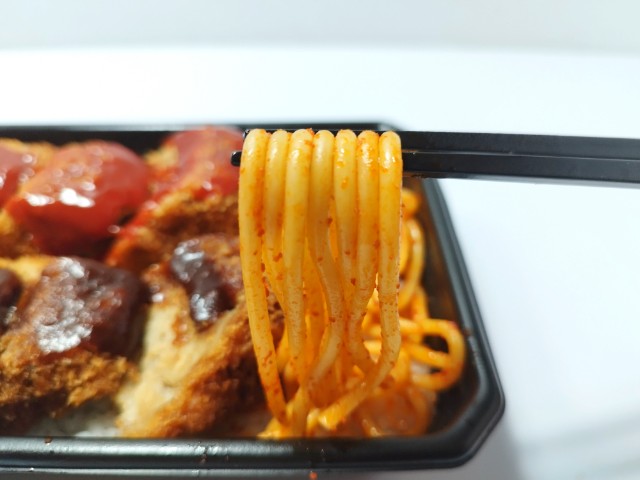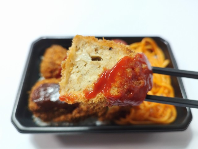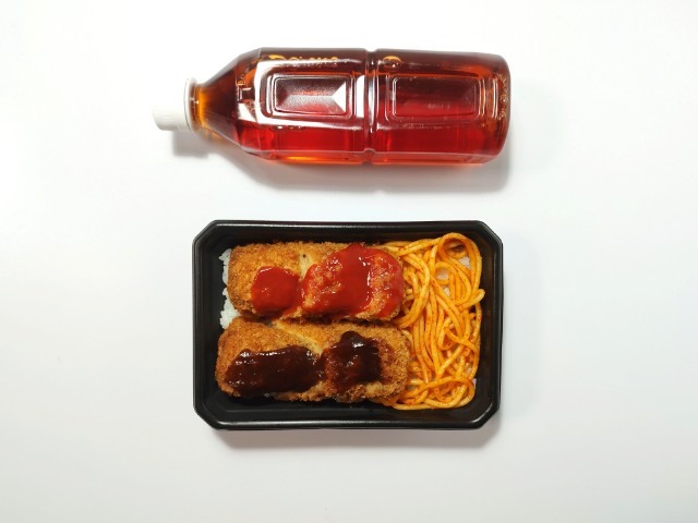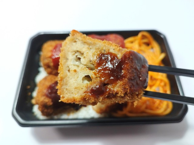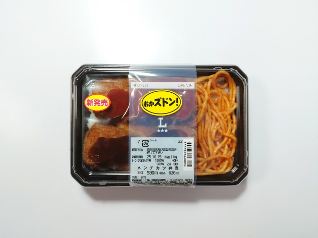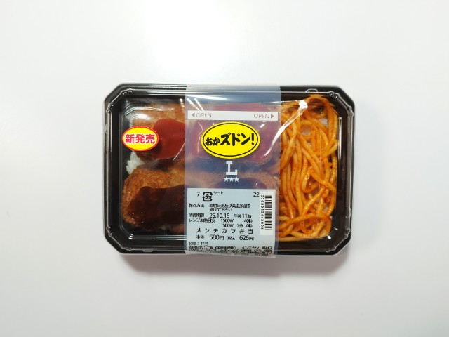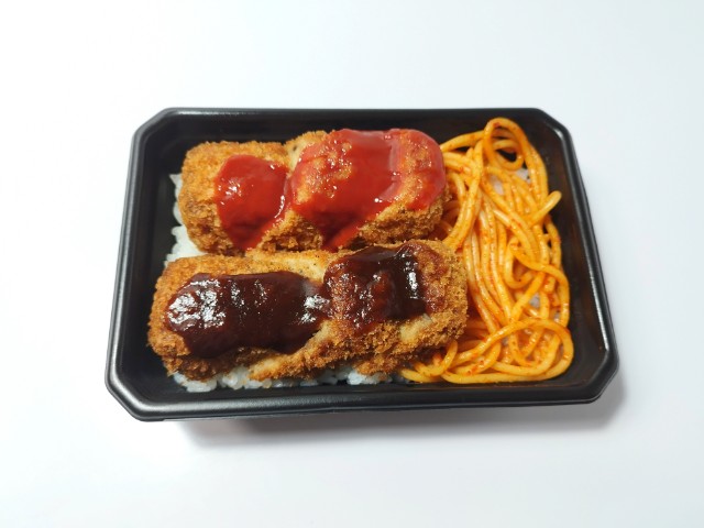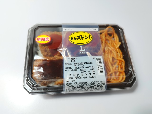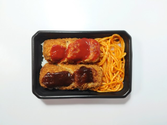 メンチカツとスパゲティがのったお弁当です。おかズドン!油淋鶏弁当(2025年7月1日発売)やおかズドン!黒胡椒にんにくだれ鶏唐揚弁当(2025年3月18日発売)など色々と出ているおかズドン!ですが、第7弾はメンチカツになっています。そんなWソースのメンチカツ弁当ですが、厚みのあるメンチカツは肉の旨味とジューシーな肉質で、食べ応えがあります。メンチカツにはとんかつソースとケチャップといった2種類のソースが使われていて、それぞれの味の違いを楽しめるので、最後まで飽きることなく食べられます。内容量は1食分にちょうどよく、お腹も満たされます。ぜひおかズドン!Wソースのメンチカツ弁当を食べてみて下さい。