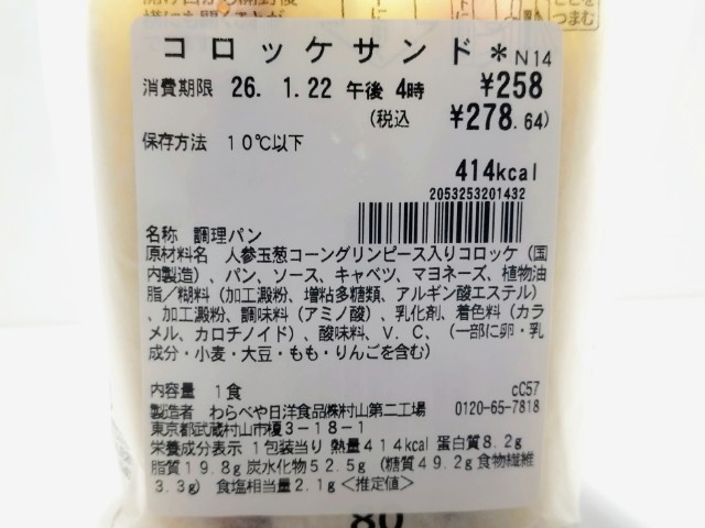 コロッケを挟んだサンドイッチです。以前の購入が2025年10月15日発売なので約3ヶ月近く経っていますが、価格は変わっていません。そんなコロッケサンドですが、コロッケはしっとりした食感とじゃがいもの味わいで、食べ応え抜群です。また、コロッケは野菜コロッケになっていて、コーンや人参、グリンピーズなどの味わいも楽しめます。他にもキャベツが一緒に挟まっていて、食感のアクセントになっています。大きさは普通のサンドイッチサイズで、小腹が空いた時や主食にあと一品追加したい時にピッタリです。ぜひコロッケサンドを食べてみてください。