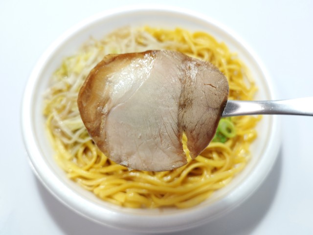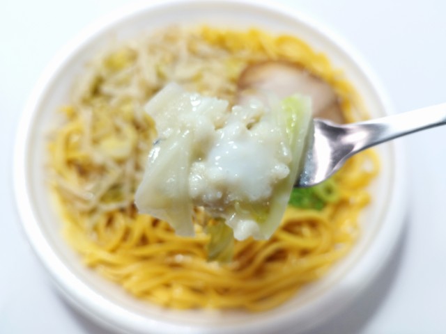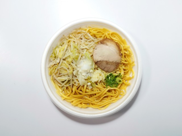 野菜や背脂がのったパスタです。背脂とパスタの組み合わせに興味をそそられて、思わず買ってしまいました。そんなニンニクパスタですが、醤油の風味と豚のコク、にんにくの味わいがあって、ハマってしまう美味しさです。特にこってりとした味わいとたっぷりの脂はパスタというよりもラーメンに近い印象で、フォークよりも箸で食べたくなります。リングイネのパスタはモチモチとした食感と小麦の風味で、濃厚な味付けにも負けていません。ただ、パスタが脂をまとっている事で、フォークで巻きとりづらく、前述にもあるように箸で食べるのがベストだと思います。具材には背脂を始め、チャーシューやもやし、キャベツ、刻みにんにくなどがのっていて、それぞれの味や食感を楽しめます。内容量は1食分にちょうどよく、お腹も満たされます。ぜひ野菜背脂のにんにくパスタを食べてみて下さい。