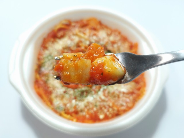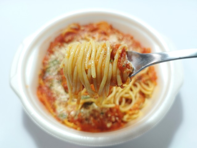 にんにくチーズを使ったトマトスープパスタです。以前ににんにくとチーズのトマトパスタ(2025年7月17日発売)がありましたが、今回はスープ仕立てになっています。そんなパスタですが、トマトの酸味にんにくの風味チーズのコクがあって、ハマってしまう美味しさです。また、唐辛子の辛味はあるものの、アラビアータのようなしっかりとした辛味ではなく、ほんのりピリ辛くらいで、どちらかというとにんにくの味わいの方がインパクトがあると思います。パスタほどよい弾力小麦の風味で、どんどんと食べ進められます。スープパスタではありますが、そこまでスープの量が多いといった感じではないので、フォークだけでも普通に食べ切れます。内容量は1食分にちょうどよく、お腹も満たされます。ぜひ青森県産にんにくのトマトスープパスタを食べてみて下さい。