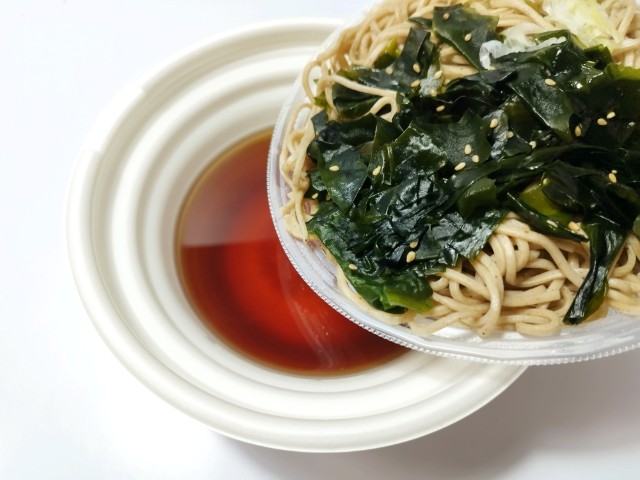 セパレートタイプなので、そばとわかめをつゆに入れます。