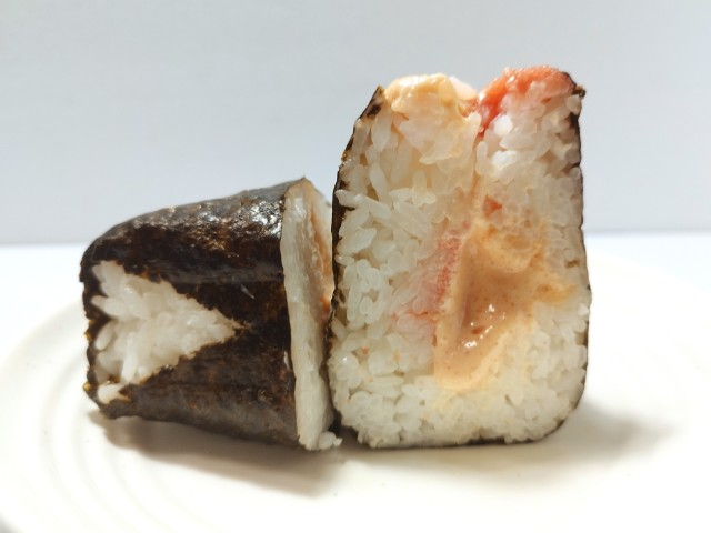 明太マヨネーズとたらこを使ったおむすびです。中具だけでなく、頭頂部にも具材がのったおむすびで、明太マヨネーズとたらこといった人気具材の組み合わせになっています。そんなおむすびですが、明太マヨネーズは明太子の味わいとマヨネーズの酸味があって、間違いのない美味しさです。たらこはたらこの旨味とほどよい塩味で、ご飯がどんどんと進みます。明太子とたらこといった食材は同じながら、それぞれ味や食感が違う事で、また違った味わいを楽しめるのも面白い部分だと思います。具材の美味しさにご飯も進みますが、今回は通常のおむすびよりもご飯の量が約1.5倍になっているので、ご飯が足らなくなる心配はありません。ぜひ明太マヨネーズとたらこの旨さ相盛おむすびを食べてみて下さい。