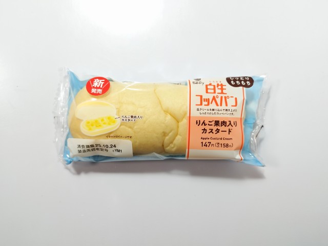 りんご果肉入りのカスタードクリームを挟んだ白生コッペパンです。これまで【安食雄二シェフ監修】白生コッペパン(レアチーズ&レモンカスタード)(2025年9月2日発売)や白生コッペパン(ダブルカフェラテ)(2025年5月3日発売)など色々なフレーバーが出ていますが、今回はりんご果肉入りのカスタードクリームとなっています。そんな白生コッペパンですが、パン生地はしっとりとした食感からのもっちりとした食感へと変わるクセになる味わいで、生コッペパンよりももっちり感が強いのが特徴です。中にはりんご果肉入りのカスタードクリームが挟んであって、りんごの甘味とカスタードクリームのなめらかな味わい、りんご果肉の食感で、生地とのバランスも良いです。袋を開けた時のりんごの香りも含めて、クリームは濃縮しているのかと思うくらいに、濃厚なりんごの味わいを楽しむ事が出来ます。大きさは普通のコッペパンサイズで、おやつや小腹が空いた時にピッタリです。ぜひりんご果肉入りのカスタードクリームの白生コッペパンを食べてみて下さい。