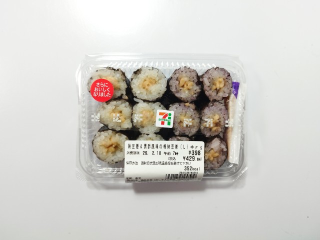 セブンイレブンの今週の新商品「納豆巻&黒酢風味の梅納豆巻」を食べてみました。