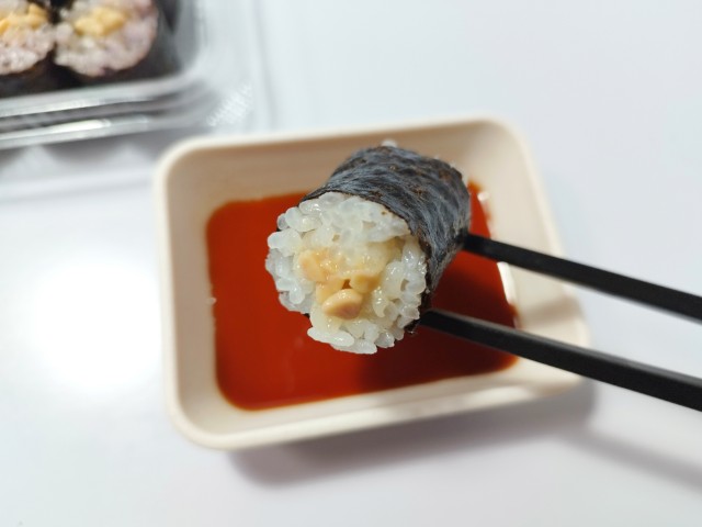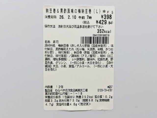 納豆巻と梅納豆巻の詰め合わせです。以前の購入が2025年10月21日発売だったので、約4ヶ月近く経っていますが、価格が370円(税込399.60円)から398円(税込429.84円)に商品名が旨味タレの納豆巻&紀州南高梅納豆巻から納豆巻&黒酢風味の梅納豆巻へと変わっています。そんな納豆巻&黒酢風味の梅納豆巻ですが、納豆巻は納豆の旨味と酢飯のほどよい酸味で、間違いのない美味しさです。梅納豆巻は納豆の旨味はもちろん、そこに黒酢の風味と梅の酸味が加わる事で、深い味わいとさっぱりとした後味を楽しむ事が出来ます。飽きのこない味わいで、カップ麺やスープなどにも合わせやすいと思います。内容量は1食分にちょっと少ないかもしれませんが、軽く済ませたい時や小腹が空いた時にはちょうどよいと思います。ぜひ納豆巻&黒酢風味の梅納豆巻を食べてみてください。