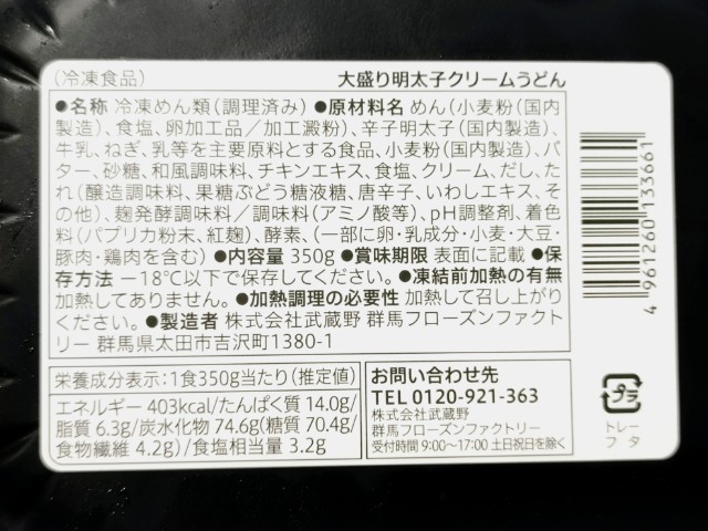 大盛りの明太クリームうどんです。冷凍食品の明太クリームうどんで、その味が気になって買ってみました。そんな明太クリームうどんですが、ソースはだしの旨味とクリームのなめらかな味わい、バターの風味があって、ハマってしまう美味しさです。うどんはもちもちとした食感と小麦の風味で、ソースとの相性抜群です。具材である辛子明太子は明太子の旨味、ねぎはシャキシャキとした食感で、それぞれ味や食感のアクセントになっています。撮影では見た目もあって、軽くしか混ぜていませんが、パッケージのレンジアップ後に必ず混ぜてからお召し上がりくださいの記述通り、しっかりと混ぜてから食べた方が、味や温かさにムラがなくて美味しいと思います。もちろん、今回においても食べる時にはしっかりと混ぜて食べています。内容量は大盛りですが、普通に比べてちょっと多いくらいで1食分にちょうどよいです。ぜひ大盛りの明太クリームうどんを食べてみて下さい。