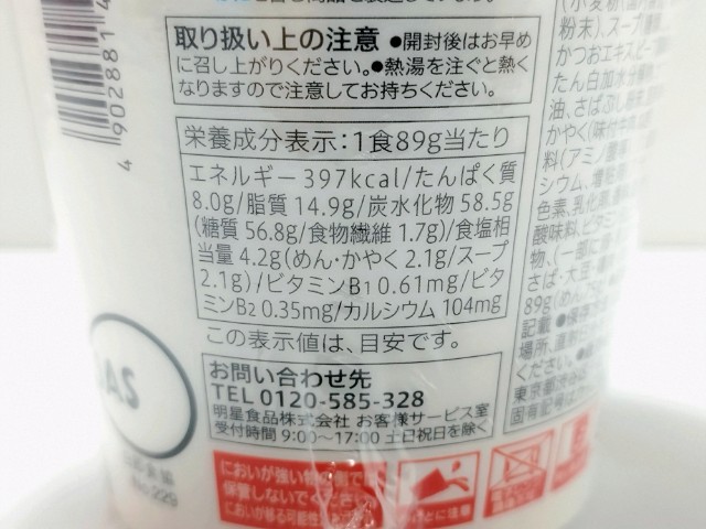 熱量:397kcal、たんぱく質:8.0g、脂質:14.9g、炭水化物:58.5g(糖質:56.8g、食物繊維:1.7g)、食塩相当量:4.2g