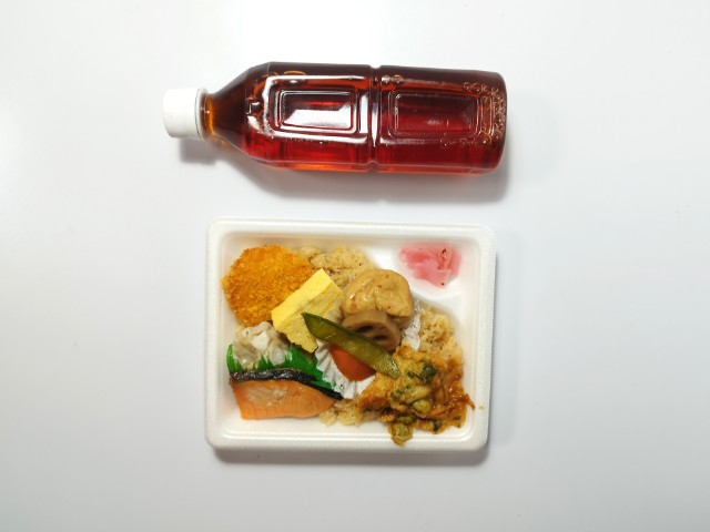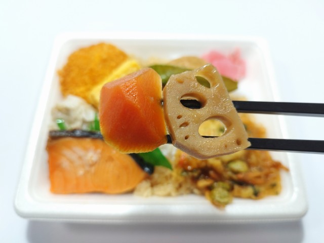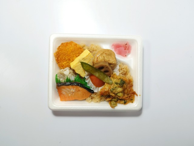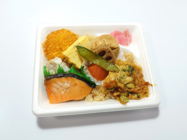 ふっくらと焼き上げた銀鮭と煮物、たまご焼き、かき揚げ、コロッケなどバラエティ豊かなおかずを7種類盛り合わせたお弁当です。