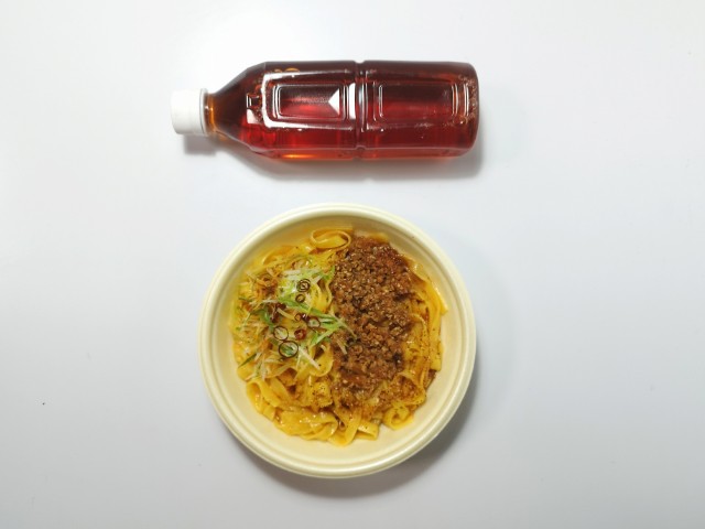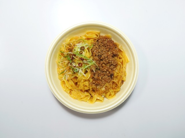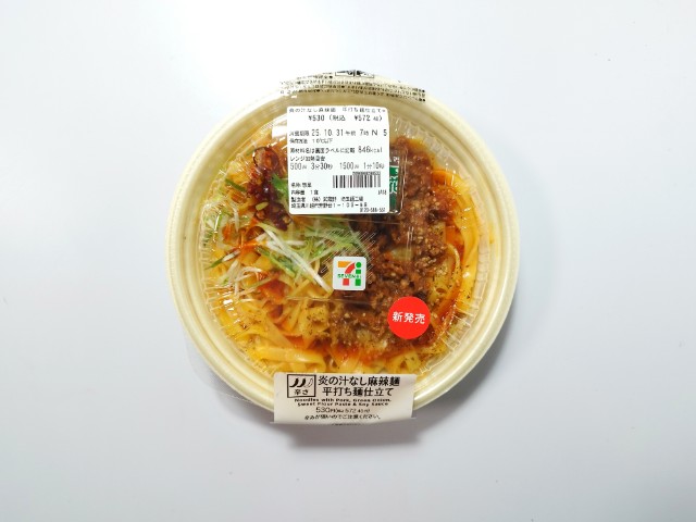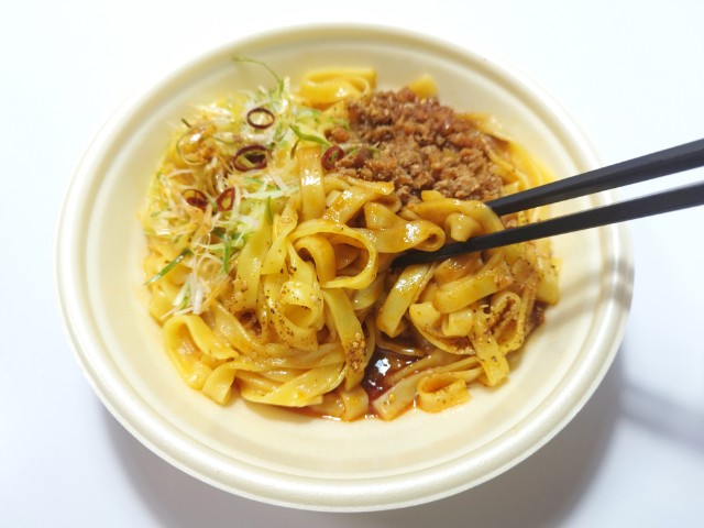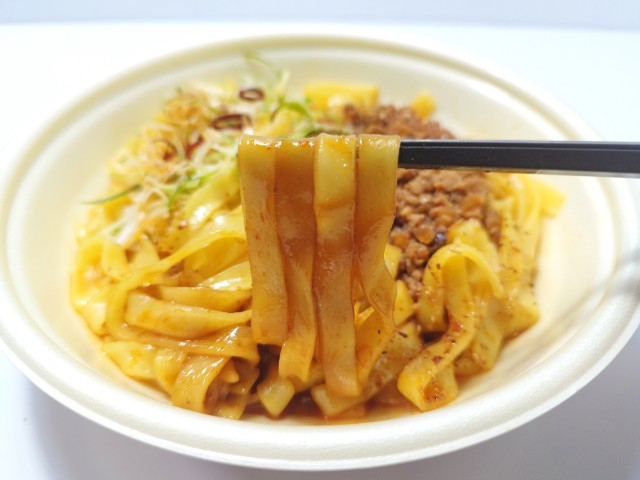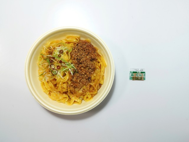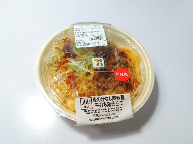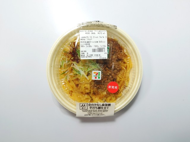 セブンイレブンの今週の新商品「炎の汁なし麻辣麺 平打ち麺仕立て」を食べてみました。