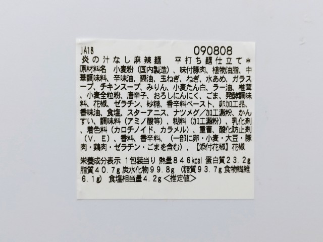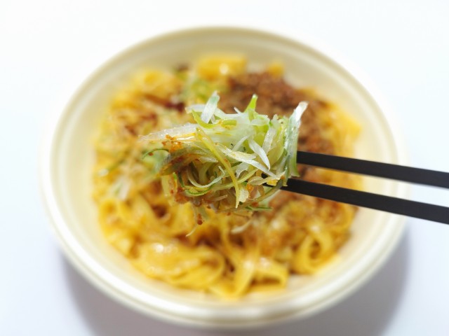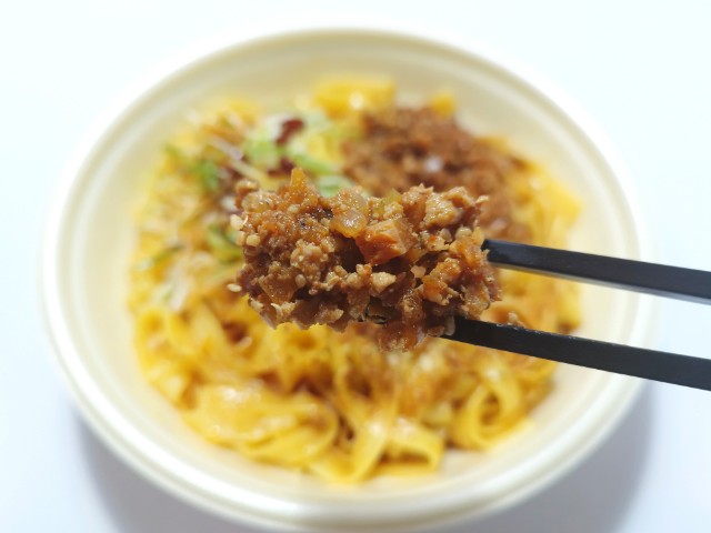 平打ち麺を使った麻辣麺です。以前に似たような商品として、シビれる辛さ 汁なし麻辣麺(2024年12月4日発売)がありましたが、こちらは幅広麺でした。そんな炎の汁なし麻辣麺ですが、唐辛子の辛味とラー油の味わい、花椒の痺れがあって、美味しいのひと言です。特にスターアニスこと八角の風味がしっかりとある事で、より麻辣麺の美味しさを楽しめます。辛味は見た目通りの辛さで、激辛ではないものの後からジワジワと辛味がやってきます。具材の肉味噌は肉の旨味が、千切りのねぎはシャキシャキとした食感で、それぞれ味や食感のアクセントになっています。また、輪切りの唐辛子は少量ながら、突然に辛味が襲ってくるので、食べる時には注意が必要です。撮影では見た目もあって、軽くしか混ぜていませんが、しっかりと混ぜて食べるのがオススメです。もちろん、食べる時にはしっかりと混ぜて食べています。内容量は1食分にちょうどよく、お腹も満たされます。ぜひ炎の汁なし麻辣麺を食べてみて下さい。