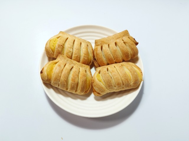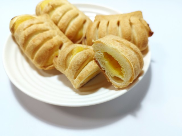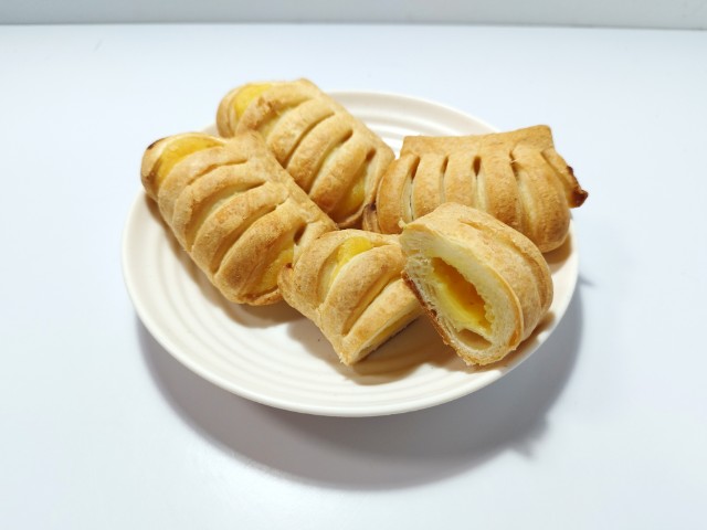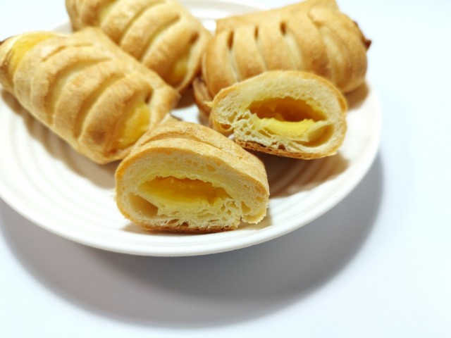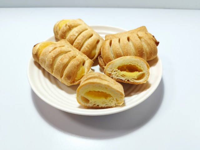 スイートポテト餡とカスタードクリームが入ったスイートポテトパイです。見つけた瞬間に手に取ってしまった商品で、個人的には楽しみにしていた新商品の一つでもあります。そんなスイートポテトパイですが、生地はみっちりとした食感と歯切れの良さで、見た目以上に食べ応えがあります。中にはスイートポテト餡とカスタードクリームが入っていて、スイートポテト餡のさつまいもの味わいとあんの甘味、カスタードクリームのねっとりとした食感とたまごの風味で、生地とのバランスも良いです。4個入ですが、1個はふた口サイズくらいなので、一人でも食べ切れなくはないですが、前述にもあるように見た目以上に食べ応えがあるので、シェアするのにピッタリです。ぜひスイートポテトパイを食べてみて下さい。