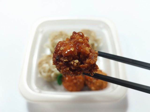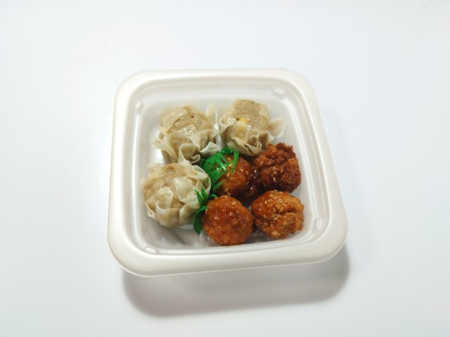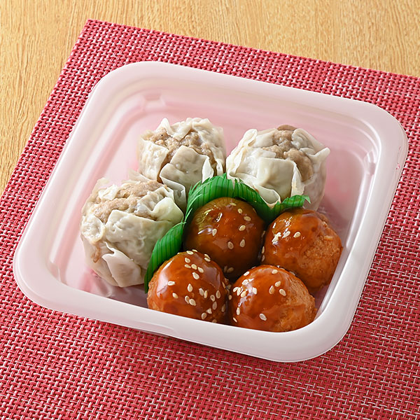 玉ねぎとたけのこが入った肉シュウマイ3個と、甘酢タレを絡めた肉団子4個を盛り付けた商品です。甘酢タレはケチャップや酢、鶏がらを合わせた、甘みと酸味が楽しめる仕立てです。