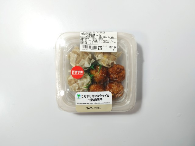 肉シュウマイと甘酢肉団子です。以前にもこだわり肉シュウマイ&黒酢肉団子(2024年6月18日発売)がありましたが、どうやら黒酢肉団子と甘酢肉団子があるようで、今回は甘酢肉団子になっています。そんなこだわり肉シュウマイ&甘酢肉団子ですが、こだわり肉シュウマイは、ひき肉のジューシーな味わいと玉ねぎの甘味、たけのこの食感があって、美味しいのひと言です。甘酢肉団子は外はしっかり、中はふっくらとした食感で、甘酢タレのほのかな甘味とやさしい酸味が、肉団子の美味しさをさらに引き立てています。内容量は一人分にちょうどよく、おつまみやご飯のおかずにあと一品追加したい時にピッタリです。ぜひこだわり肉シュウマイ&甘酢肉団子を食べてみて下さい。