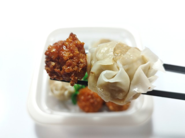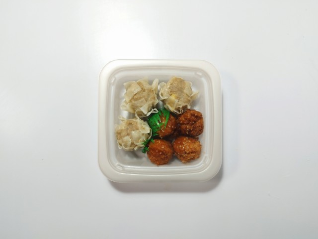 肉シュウマイ3個と甘酢肉団子4個入っています。