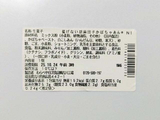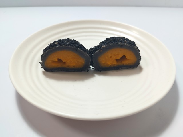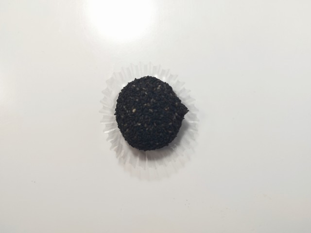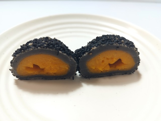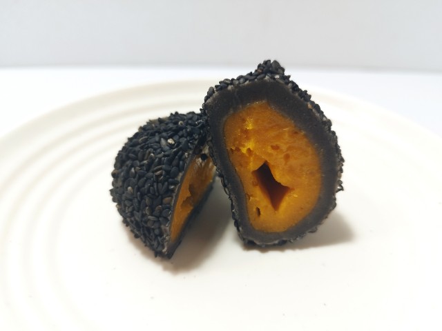 かぼちゃあんが入った胡麻団子です。以前にも揚げない胡麻団子(2025年6月18日発売)や揚げない胡麻団子 さつまいもあん(2024年10月15日発売)がありましたが、今回はかぼちゃあんになっています。そんな胡麻団子ですが、生地は黒ごまのプチプチとした食感ともちもちとした生地の食感、ごまの味わいがあって、クセになる美味しさです。中のかぼちゃあんはかぼちゃの味わいとあんの甘味があって、生地とのバランスも良いです。商品名の通り、揚げていないのであっさりと食べられるのもポイントが高いと思います。大きさはふた口サイズくらいで、お茶請けや軽く甘味が欲しい時にピッタリです。ぜひかぼちゃあんの揚げない胡麻団子を食べてみて下さい。