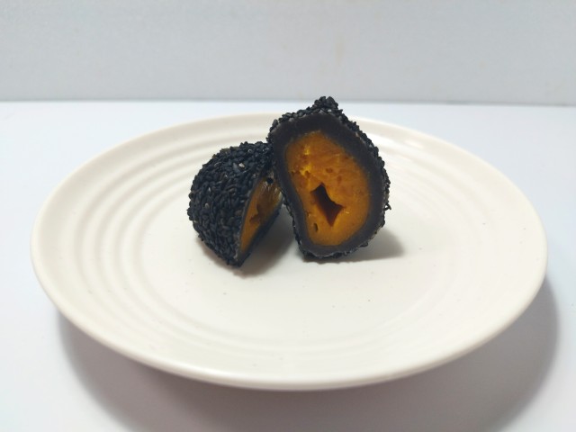 もちもちの生地でかぼちゃあんを包み、黒ごまをまぶして焼き上げた胡麻団子です。