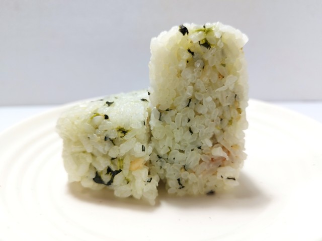小松菜を混ぜ込んだおむすびです。梅と小松菜の使ったおむすびで、ちょっと変わった組み合わせもあって、思わず手に取ってしまいました。そんな小松菜と梅の菜めしおむすびですが、ご飯は細かく刻まれた小松菜が混ぜ込まれていて、だしの旨味と小松菜の味わい、胡麻の風味があって、間違いのない美味しさです。セブンイレブン公式の商品説明だと中具に梅らしいですが、中具というよりも小松菜同様にご飯に混ぜ込まれている感じに今回はなっていました。これは個体差によるもので、たまたまなのかもしれませんが、個人的には梅の酸味のバランスがよくて、混ぜ込まれている方が良いと思います。大きさは普通のおむすびサイズで、小腹が空いた時や主食にあと一品追加したい時にピッタリです。ぜひ小松菜と梅の菜めしおむすびを食べてみて下さい。