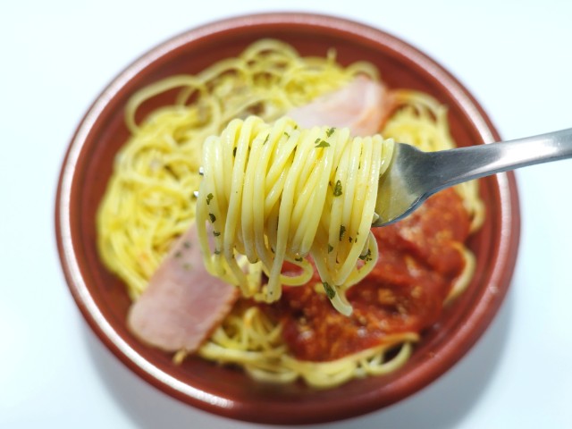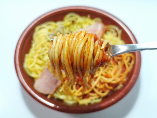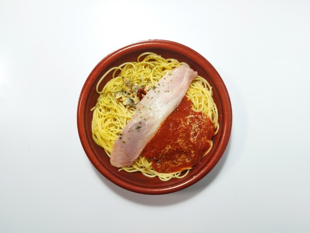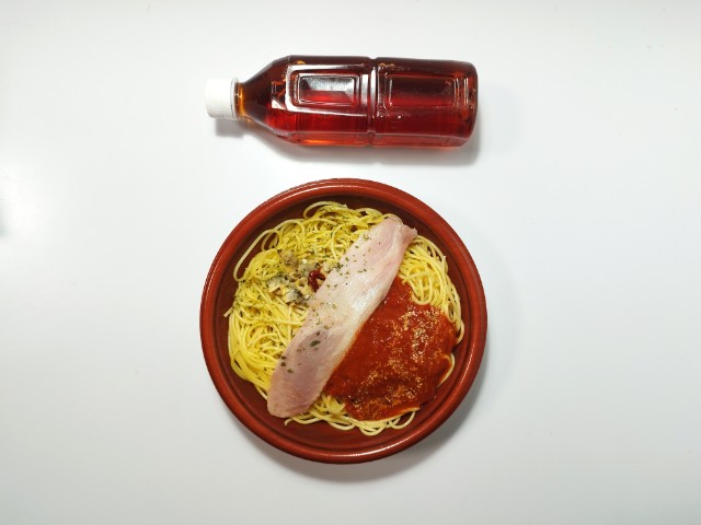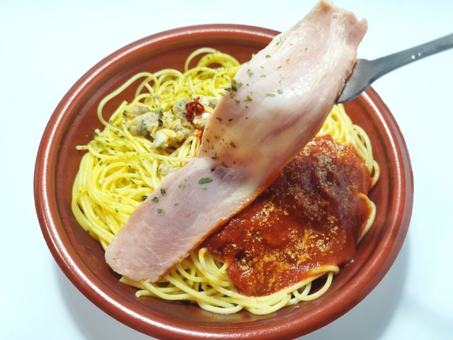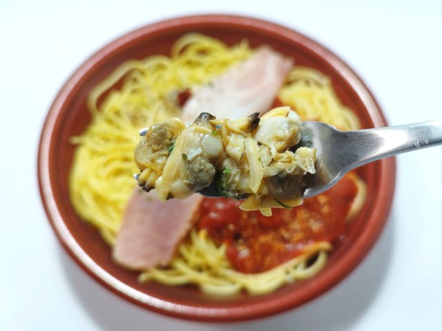 ボンゴレトマトソースパスタを同時に楽しめる商品です。2種類のパスタを楽しめる商品で、同時発売されたよくばりセットメシ 醤油ラーメン&チャーハン(2025年10月21日発売)とはまた違った内容になっています。そんなよくばりセットメシですが、ボンゴレあさりの風味やさしい塩味トマトソーストマトの酸味バジルの風味で、それぞれ違った味わいを楽しめます。パスタほどよい硬さ小麦の風味で、食べ応えがあります。ベーコンを境に分かれているようですが、食べている途中でほぼ一緒になってしまいます。ただ合わせて食べるのもまた美味しいといった感じで、また違ったパスタの美味しさを楽しめます。内容量は1食分にちょうどよく、お腹も満たされます。ぜひボンゴレ&トマトよくばりセットメシを食べてみて下さい。