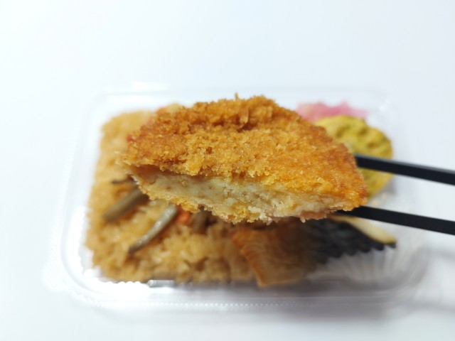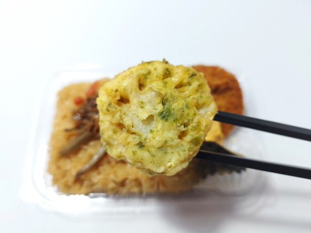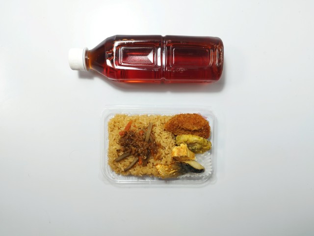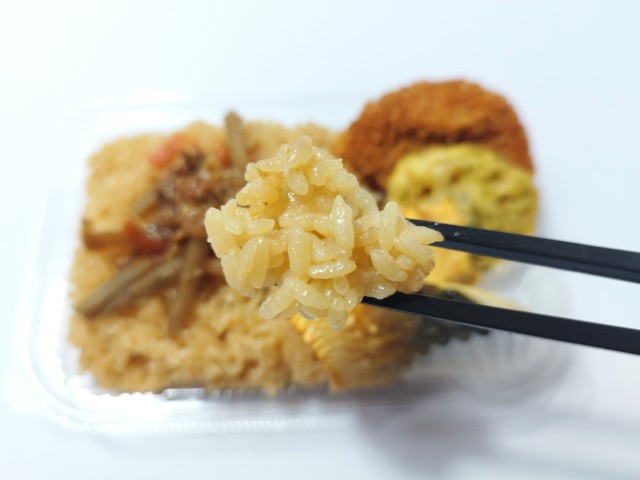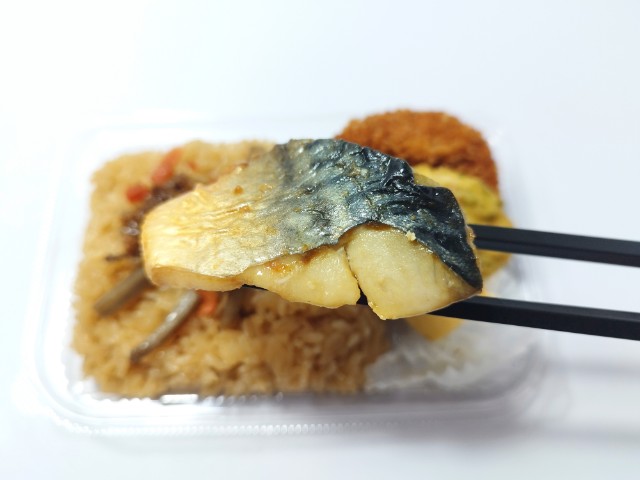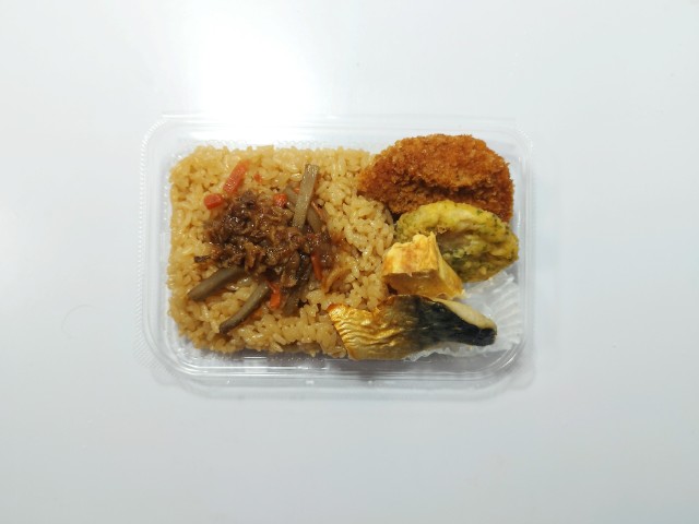 色々なおかずがのったお弁当です。以前の購入が2025年12月9日発売だったので、約1ヶ月近く経っていますが、価格は変わっていません。そんな彩りおかず弁当ですが、牛しぐれ煮とごぼう炒めがのった味付ご飯はだしの旨味と醤油の風味で、美味しいのひと言です。おかずにはさば醤油漬焼や蓮根磯辺揚げ、コロッケ、玉子焼などといった人気惣菜が入っていて、味のバランスも良いです。他にも箸休めの漬物があったりと最後のひと口まで飽きることなく食べられます。内容量は1食分にちょうどよく、お腹も満たされます。ぜひ彩りおかず弁当を食べてみてください。