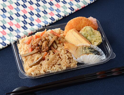 牛しぐれ煮と牛蒡炒めを盛り付けた出汁ご飯に、さば醤油漬焼、蓮根磯辺揚げ、コロッケ、玉子焼、漬物を合わせ、彩り良く盛り付けました。常温弁当の為、お出かけ先でも温めずに食べられます。