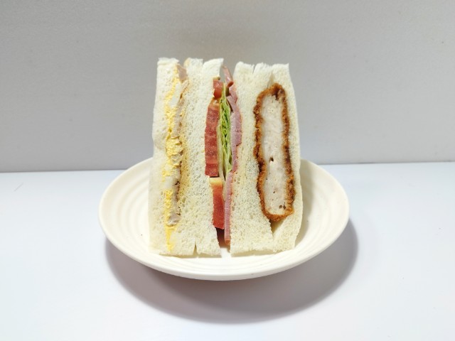 人気サンドの「BLT」と「照り焼きチキンとたまご」と「チキンカツ」を組み合わせたよくばりなミックスサンドです。ワンコインでボリューム満点なサンドイッチです。
