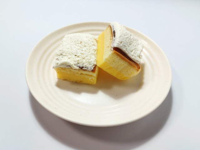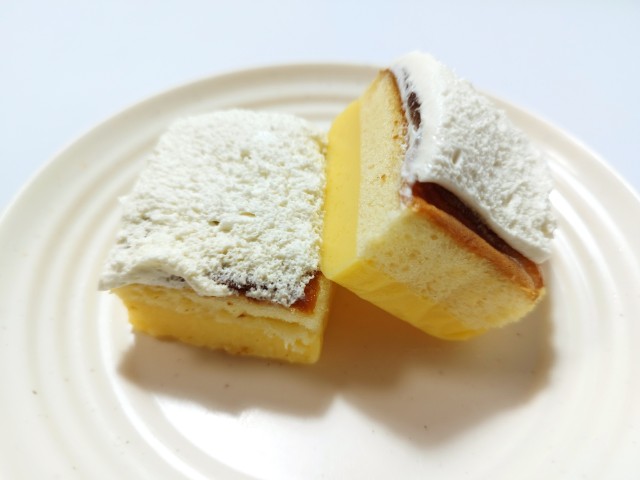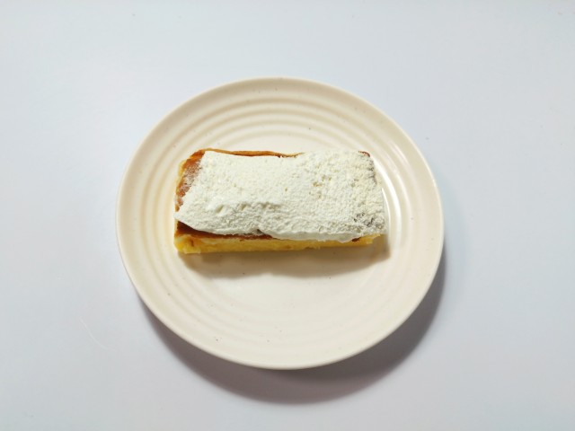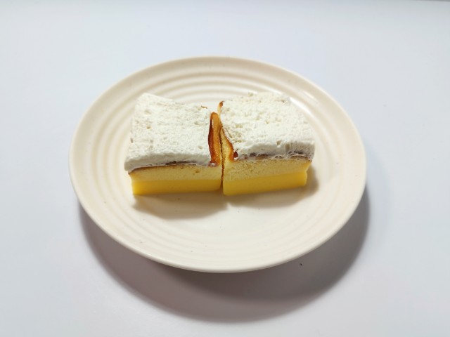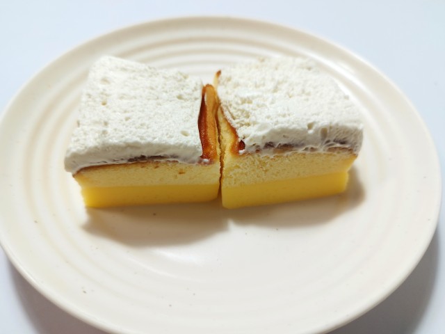 プリンシフォンスティックケーキです。スティックタイプのプリンとシフォンケーキの組み合わせに惹かれて買ってみました。そんなプリンシフォンスティックケーキですが、上からホイップクリーム、シフォンケーキ、プリンとなっていて、ホイップクリームはなめらかな食感とミルクの風味で、安定の美味しさです。シフォンケーキはしっとりとした食感とメープルの味わい、プリンはみっちりとした食感とたまごのコクで、それぞれの味や食感の違いを楽しめます。正直、プリンのスイーツではなく、プリン風味のスイーツといった感じで、プリンを期待するとちょっと厳しいですが、スティックケーキとして楽しむには十分だと思います。大きさは一人分にちょうどよく、おやつや食後のデザートにオススメです。ぜひプリンシフォンスティックケーキを食べてみて下さい。