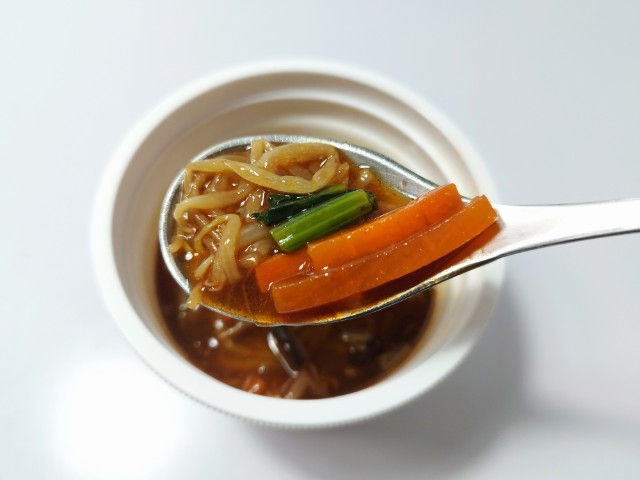 太麺春雨が入った麻婆スープです。旨辛麻婆スープという言葉で美味しいイメージしかなく、思わず手に取ってしまいました。そんな旨辛麻婆スープですが、スープは牛の旨味と唐辛子の辛味、花椒の香りがあって、ハマってしまう美味しさです。具材には豚肉や鶏肉、もやし、人参、きくらげ、小松菜、牛すじなど色々と入っていて、それぞれの味や食感を楽しめます。ポイントはやはり太麺春雨で、もちっとした食感とのどごしの良さで、食べ応え抜群です。見た目ほど辛味はありませんが、それでも辛いのが苦手な方は注意した方が良いと思います。内容量は一人分にちょうどよく、小腹空いた時や主食にあと一品追加したい時にピッタリです。ぜひ旨辛麻婆スープを食べてみて下さい。