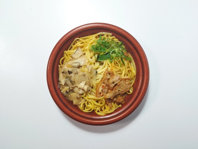 きのこ照り焼きチキンを使った和風生パスタです。以前にこだわりおだし 豚しゃぶとオクラ(2025年7月1日発売)こだわりおだし あさりとあおさ(2025年5月13日発売)などがありましたが、今回はきのこ鶏肉を使ったパスタになっています。そんなこだわりおだしの生パスタですが、だしの旨味ほどよい塩味きのこの風味があって、食べ出すと止まらなくなる美味しさです。パスタもちもちとした食感小麦の風味があるリングイネが使われていて、和風ベースの味付けにもよく合います。具材にはエリンギひらたけといったきのこを始め、照り焼きチキンねぎなどがのっていて、それぞれの味や食感を楽しめます。内容量は1食分にちょうどよく、お腹も満たされます。ぜひのこだわりおだしの生パスタを食べてみて下さい。