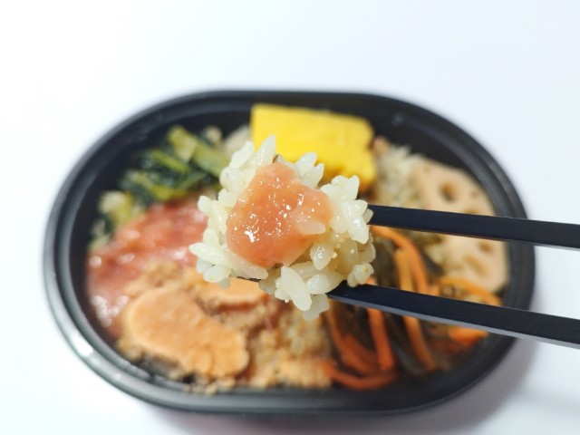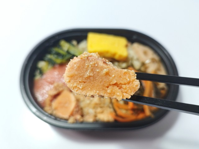 バターを合わせたたらこと炙りたらこの2種類を盛り付けた、買い合わせに丁度良いサイズのお弁当です。