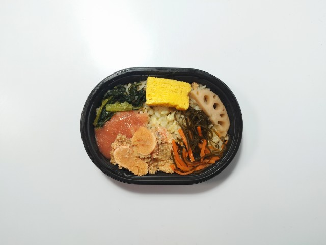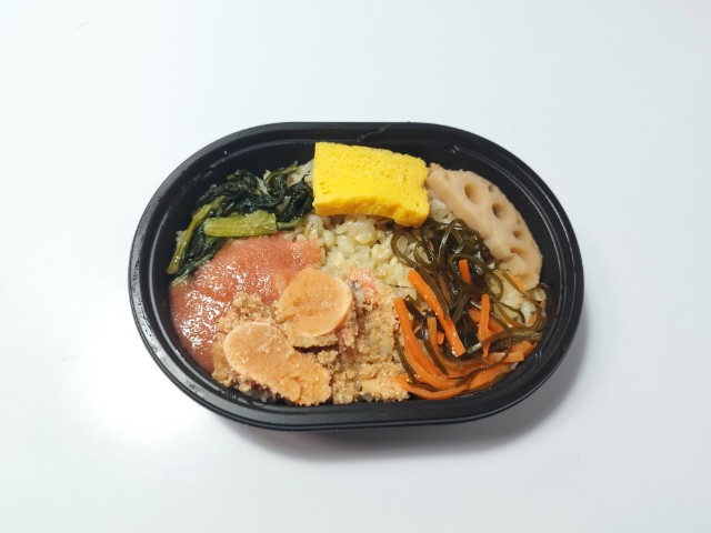 バター醤油たれを和えたたらこ炙りたらこがのったミニ弁当です。見つけた瞬間に手に取ってしまった商品で、個人的には楽しみにしていた新商品の一つでもあります。そんなたらこバターごはんですが、バター醤油和えのたらこなめらかな味わいバターの風味たらこの風味で、ご飯が進む一品になっています。炙りたらこたらこの旨味ほどよい塩味で、こちらもご飯との相性抜群です。他にも厚焼玉子昆布煮れんこん煮小松菜炒めなどがのっていて、それぞれの味や食感を楽しめます。また、ご飯味付けされた麦飯になっている事で、醤油の風味食感の良さを楽しめるのもポイントが高いと思います。内容量はそこまでありませんが、小腹が空いた時軽く済ませたい時にピッタリだと思います。ぜひたらこバターごはんを食べてみて下さい。