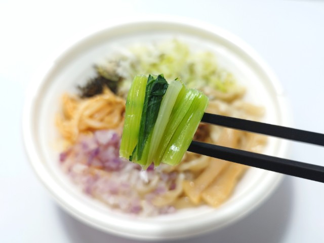 6種類の具材がのったまぜそばです。見つけた瞬間に手に取ってしまった商品で、個人的には楽しみにしていた新商品の一つでもあります。そんなちゅるもち6種具材のまぜそばですが、麺はちゅるもちの言葉通り、もちもちとした食感とのどごしの良さで、箸がどんどんと進みます。たれは醤油の風味とほどよい塩味で、濃厚な味わいながら後味はスッキリとしています。具材には紫ねぎや小松菜、肉味噌、メンマ、辛もやし、ねぎなどがのっていて、それぞれの味や食感を楽しめます。撮影では見た目もあって、軽くしか混ぜていませんが、しっかりと混ぜて食べるのがオススメです。もちろん、食べる時にはしっかりと混ぜて食べています。内容量は1食分にちょうどよく、お腹も満たされます。ぜひちゅるもち6種具材のまぜそばを食べてみて下さい。