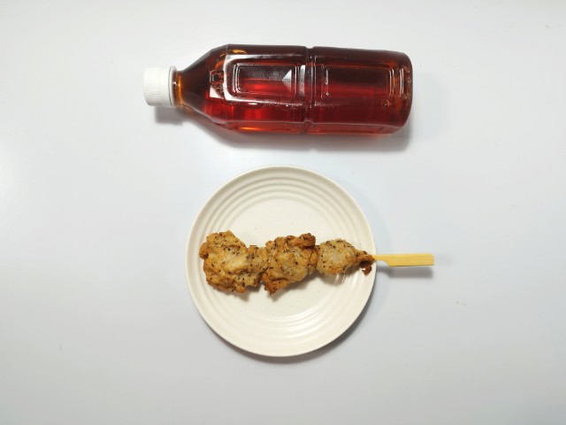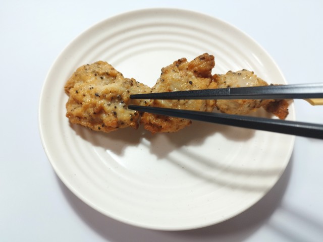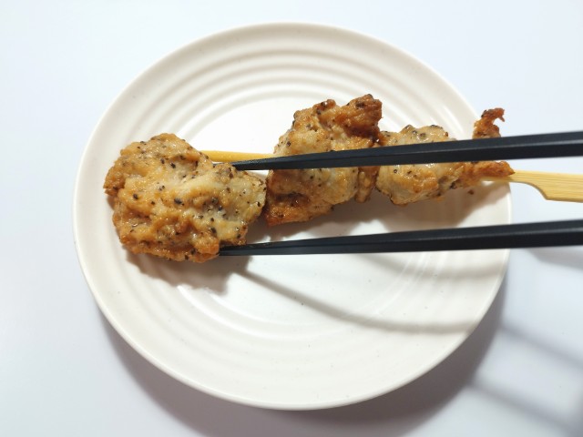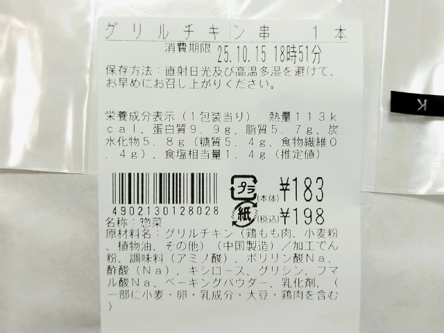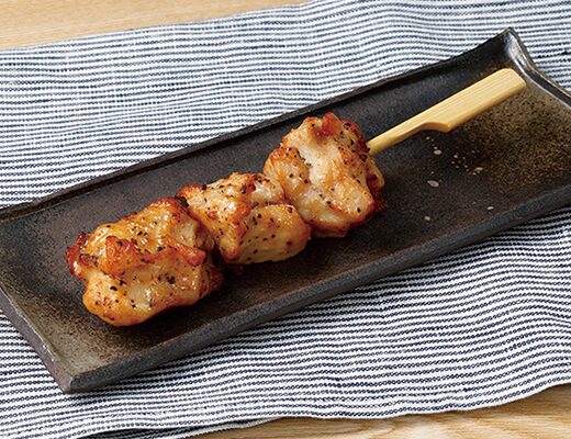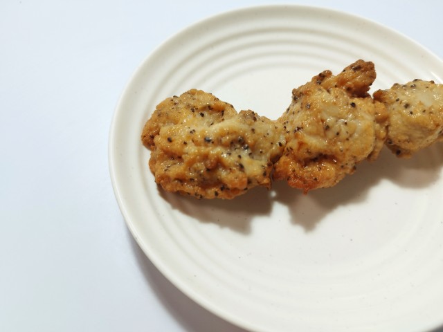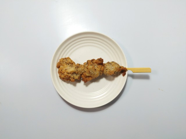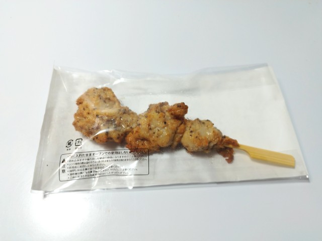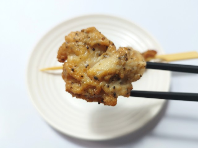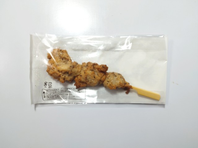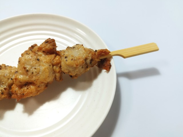 グリルチキン串です。グリルチキン串も色々なフレーバーが出ていますが、今回はオーソドックスなタイプになっています。そんなグリルチキン串ですが、鶏もも肉は鶏の旨味とほどよい弾力、ジューシーな味わいがあって、間違いのない美味しさです。味付けにはにんにくと醤油が使われていて、にんにくの風味と醤油の塩味で、鶏肉の美味しさがさらに引き立てられています。ワンハンドで手軽に食べられるので、おつまみや小腹が空いた時にピッタリです。ぜひグリルチキン串を食べてみて下さい。