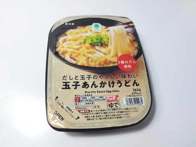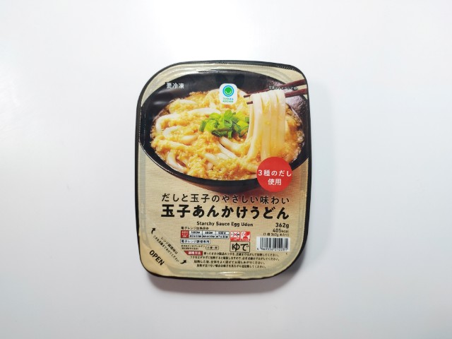 玉子あんかけうどんです。容器がそのまま器の代わりになっている冷凍食品のうどんで、電子レンジで500W7分30秒温めると完成です。そんな玉子あんかけうどんですが、たまごあんかけはだしの旨味とたまごの甘味、とろりとした食感で、美味しいのひと言です。うどんはもちもちとした食感と小麦の風味で、たまごあんかけとのバランスも良いです。全体的にはやさしい味わいで、シンプルながら食べやすいうどんといった印象です。今回はそのまま食べましたが、七味唐辛子や黒胡椒を加えて、味変しながら食べても美味しいと思います。内容量は1食分にちょうどよく、お腹も満たされます。ぜひ玉子あんかけうどんを食べてみて下さい。