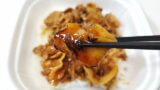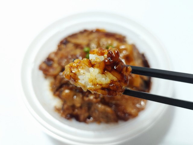醤油タレで味付けされた豚丼です。食欲をそそる見た目で、思わず手に取ってしまいました。そんな炙り焼豚丼ですが、豚肉は豚の旨味とジューシーな味わい、醤油タレの甘辛い味付けで、ご飯が進む一品になっています。特に味付けである醤油タレは濃厚な味わいで、豚肉だけでなくご飯にかけてタレご飯としても美味しく食べられます。今回はそのまま食べましたが、卵黄をのせたり、七味唐辛子をかけて味変しながら食べても美味しいと思います。内容量は1食分にちょうどよく、お腹も満たされます。ぜひ炙り焼豚丼を食べてみて下さい。