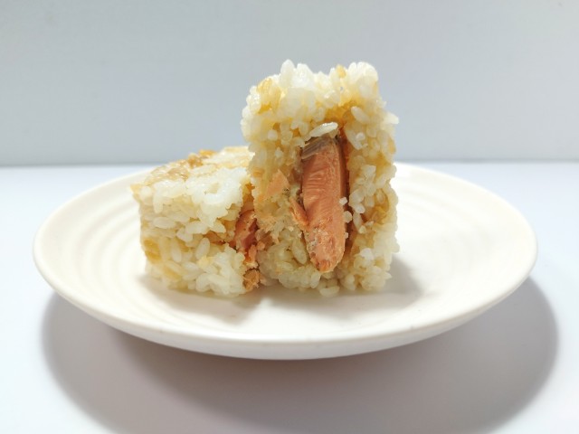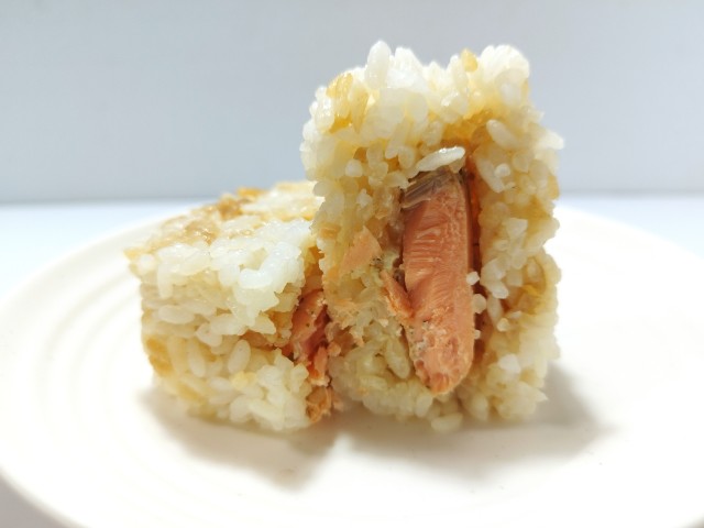 銀鮭やタルタルソースを使ったおむすびです。銀鮭の香草焼きに惹かれて買ってみました。そんな銀鮭の香草焼きおむすびですが、銀鮭は切身になっていて、鮭の旨味とにんにくの風味、香草の香りがあって、ご飯が進む一品になっています。ご飯にはだし醤油がまぶされていて、銀鮭との味のバランスも良いです。ポイントは銀鮭と一緒に入っているタルタルソースで、たまごの味わいとマヨネーズの酸味が銀鮭の美味しさをさらに引き立てています。大きさは普通のおむすびサイズで、小腹が空いた時や主食にあと一品追加したい時にピッタリです。ぜひ銀鮭の香草焼きおむすびを食べてみて下さい。