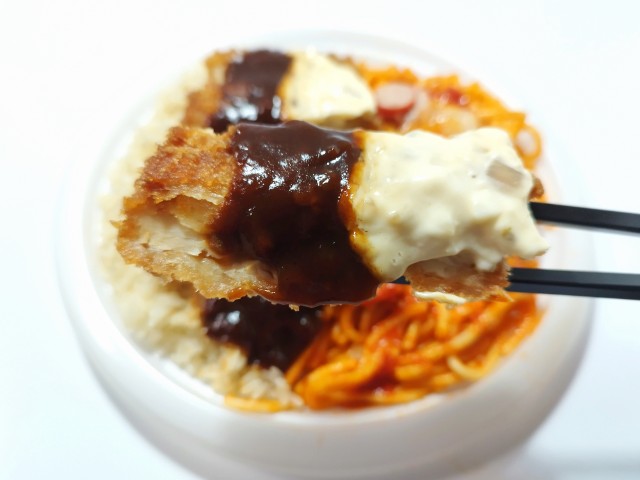 チキンカツナポリタンがのったお弁当です。今回、商品名には入ってはいませんが、どか盛り タルタルチキン南蛮&ナポリタン(2025年5月6日発売)ドカ食いダイスキ!もちづきさんとのコラボでもあるバターピラフ&濃厚デミチキンカツナポリタン(2025年2月18日)などといったどか盛りシリーズの一つともいえるお弁当だと思います。そんなデミタルチキンカツ&ナポリタンですが、厚みのあるチキンカツ衣がサクッとはいかないものの、鶏肉柔らかい肉質ジューシーな味わいで、食べ応えもしっかりとあります。バターピラフパラパラとした食感ブイヨンの旨味バターの風味があって、これだけでも美味しく食べ進められます。ナポリタンほのかな酸味もちっとした食感で、安定の美味しさです。ポイントはデミグラスソースタルタルソースチキンカツの美味しさをさらに引き立ててくれます。また、バターピラフナポリタンソースを掛け合わせる事で、また違った味わいも楽しめます。1,019kcalと予想通りのハイカロリーのお弁当で、ガッツリ食べたい方にはちょうどよいお弁当だと思います。ぜひデミタルチキンカツ&ナポリタンを食べてみて下さい。