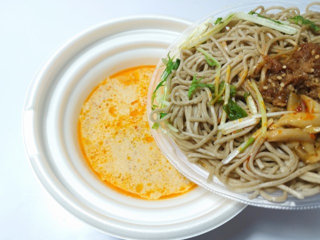 胡麻,豆乳を使用した濃厚なつゆでそばを味わう商品です。具材は肉味噌,水菜,しめじ,エリンギを組み合わせた仕立てです。