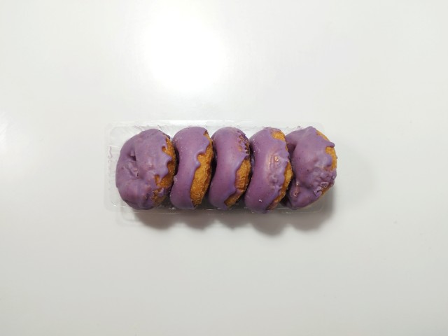 3種のベリーを使ったミニリングドーナツです。ストロベリーとクランベリー、ブルーベリーの3種のベリーを使ったミニリングドーナツで、その見た目に惹かれて買ってみました。そんなミニリングドーナツですが、生地はしっとりとした食感といちごの甘味、クランベリーの味わいがあって、間違いのない美味しさです。生地にはブルーベリーシュガーグレーズがかかっていて、ブルーベリーの風味とほどよい甘味を楽しめます。見た目のインパクトと違って、味はやさしいベリーの風味とほのかな酸味があるくらいで、全体的にはオーソドックスなドーナツに近いので、かなり食べやすいと思います。5個入ですが、1個はふた口サイズくらいなので、一人でも普通に食べ切れます。もちろんシェアするにもピッタリだと思います。ぜひミニリングドーナツ3種のベリーを食べてみて下さい。